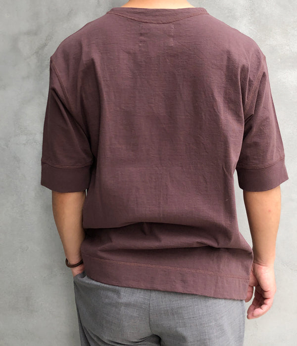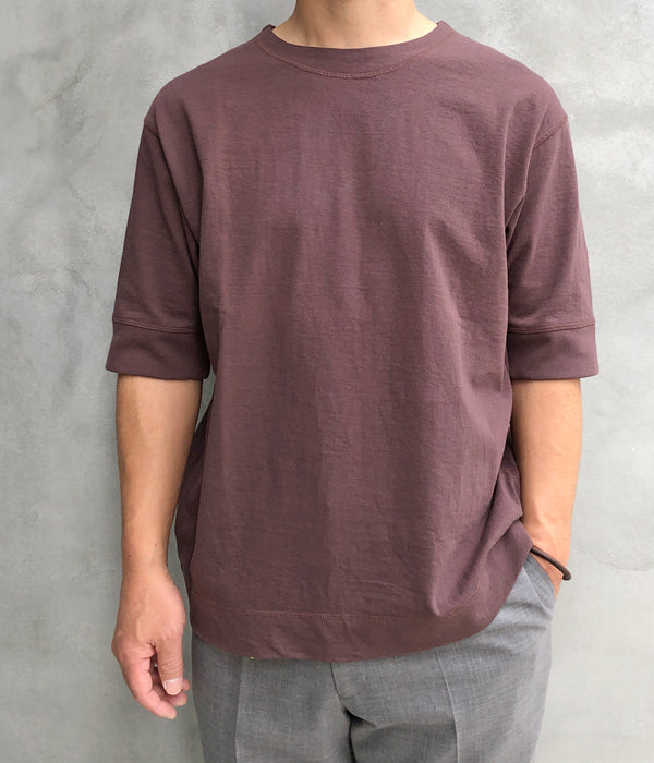 MHL.から、HEAVY COTTON JERSEY SSが入荷しました。しっかりとした質感のヘビーコットンを使用したやや長めの半袖Tシャツ。袖口と裾のフライスリブ、カバーステッチのディテールがポイント。独特の生地ムラによる表情豊かな存在感のある無地Tシャツです。