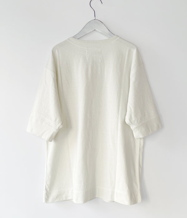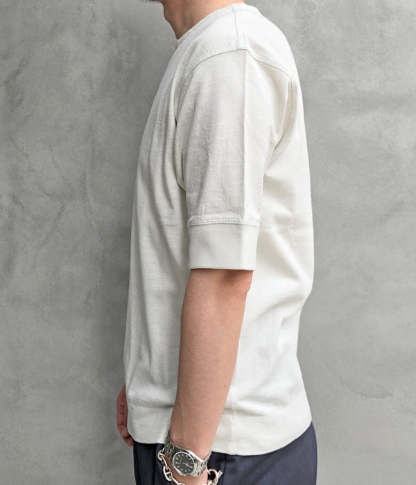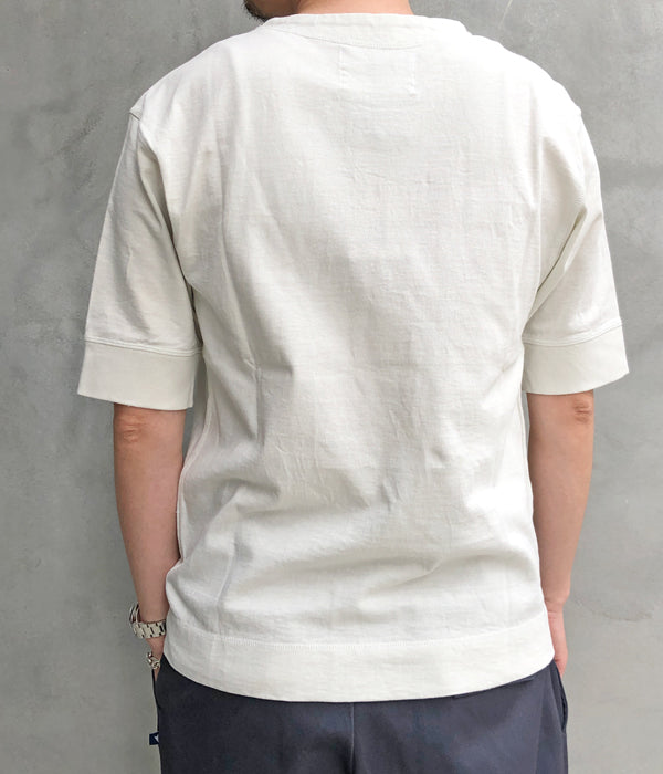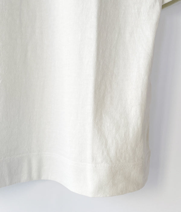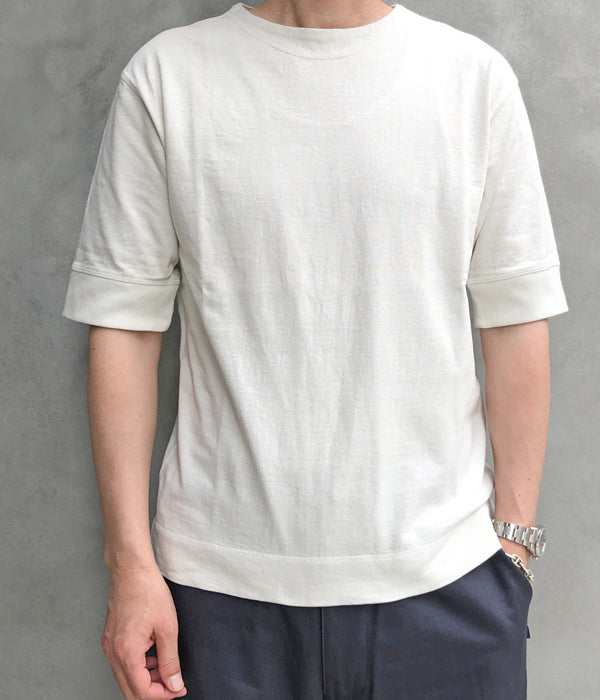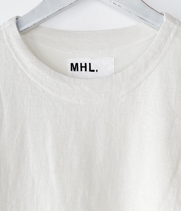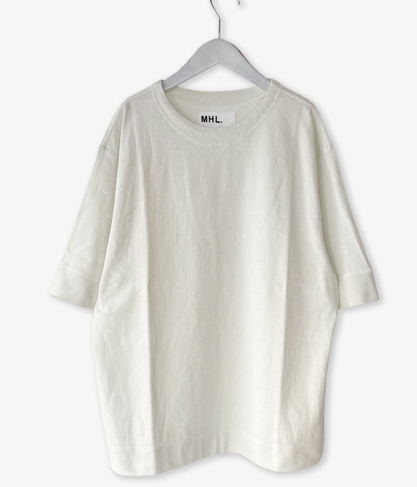 MHL.から、HEAVY COTTON JERSEY SSが入荷しました。しっかりとした質感のヘビーコットンを使用したやや長めの半袖Tシャツ。袖口と裾のフライスリブ、カバーステッチのディテールがポイント。独特の生地ムラによる表情豊かな存在感のある無地Tシャツです。