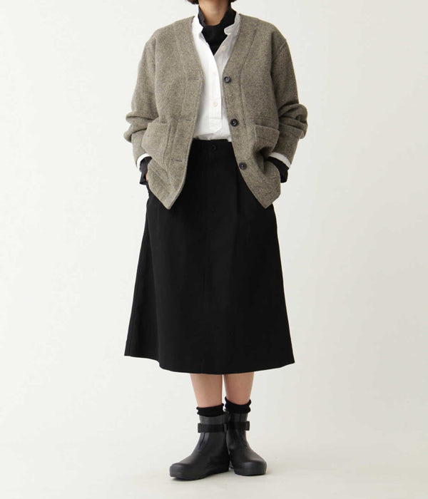 MHL.から、JAPANESE DENSE COTTON SKIRTが入荷しました。やや厚手でタフな質感ながらも、軽やかで柔らかな履き心地の良いスカート。2タックにウェストアジャスター付きのあそびのあるサイジングなので、タックイン/アウトどちらもサイズフィットが可能。バックにスリットが入ります。