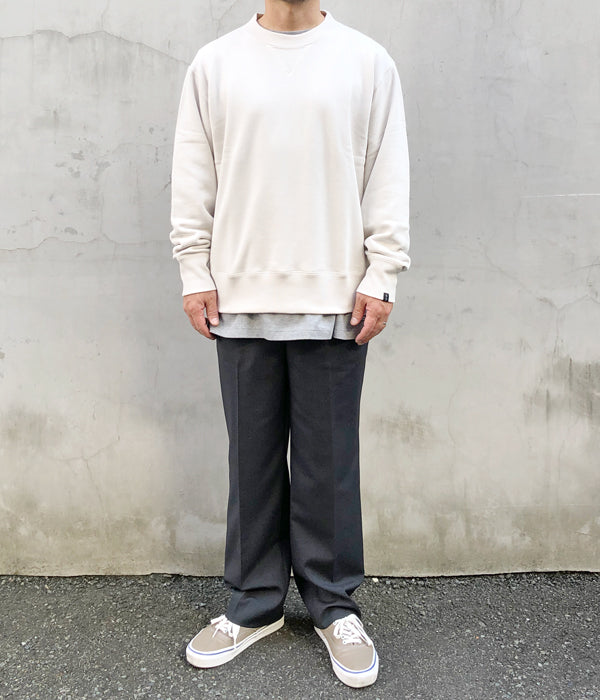 MHL.から、LIGHT LOOPBACK COTTON LOOPWHEELER CNが入荷しました。Vガゼットに、存在感のあるリブ、吊り編み仕立てのふっくらとした質感の裏パイルによる正統派の1着。適度にゆったりとしたサイジングに仕立てた着回しのきく作りです。袖口にアイコンディテールでもあるループウィラーのネーム付き(ブラックベースにホワイトロゴなっているのはMHLオリジナルカラー)。