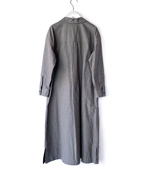MHL.から、MELANGE COTTON CHAMBRAY OPが入荷しました。密度の高い打ち込みによるハリのあるタフな質感のコットンシャンブレーを使用したドレスワンピース。第一ボタンをやや低めに設計したラフな抜け感のあるオープンカラーの襟元、大きなボタンと、大きなバストポケットもカジュアル感を演出します。サイドポケット付き。
