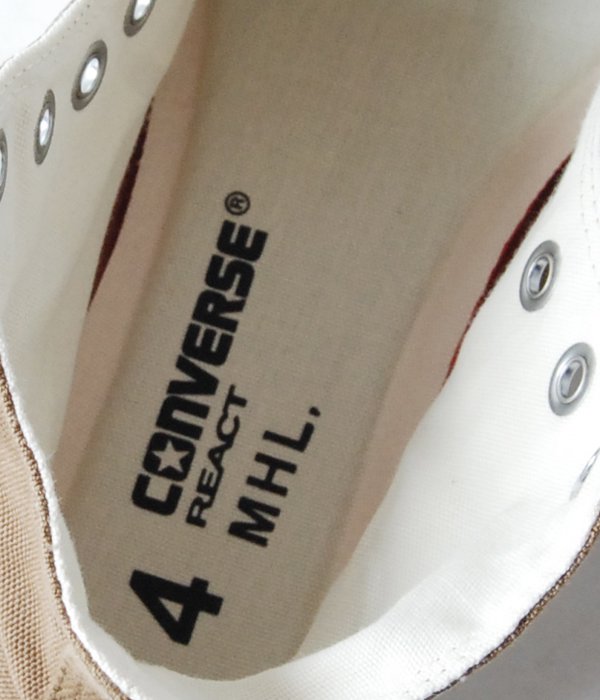 MHL. x CONVERSEより"ALL STAR 100"をベースとしたリミテッドモデルが登場。踵のヘリンボーンテープや、やや細身に仕上げたオーセンティックなコットンシューレースなど、随所に拘りが詰まった一足。また、CONVERSEオリジナルのカップインソール"REACT"を搭載し、クッション性やフィット感に優れ、履き心地も別格の仕上がり。こちらはLADYS SIZEとなります。