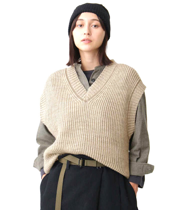 MHL.から、NATURAL WOOL RIB VEST WOMENSが入荷しました。柔らかなウール素材を使用したニットベストです。ボリュームのあるリブ編みニットをカバーステッチで仕立てました。肩幅を広めにとった肩周りのルーズさが印象的な一着です。裾のスリットもポイント。