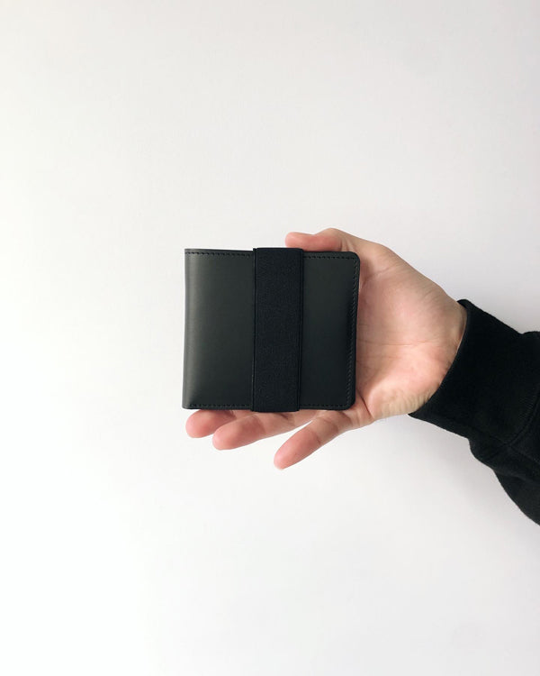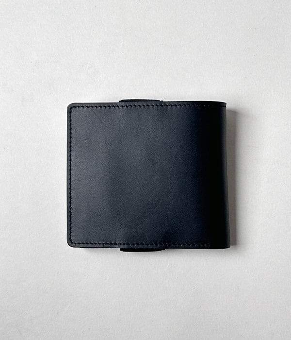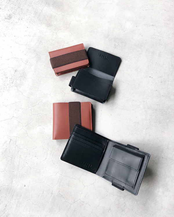 MHL.から、SMOOTH LEATHER WALLETが入荷しました。滑らかな表情が特徴のレザー製二つ折りウォレット。傷が目立ちにくい加工がされており、長年の使用にも耐えうるタフな作り。小銭、カード、紙幣と最低限の収納を抑えており、本体に縫い込んだゴムストラップでフラップを留めるデザイン。内側のMHL.の型押しロゴがポイントです。