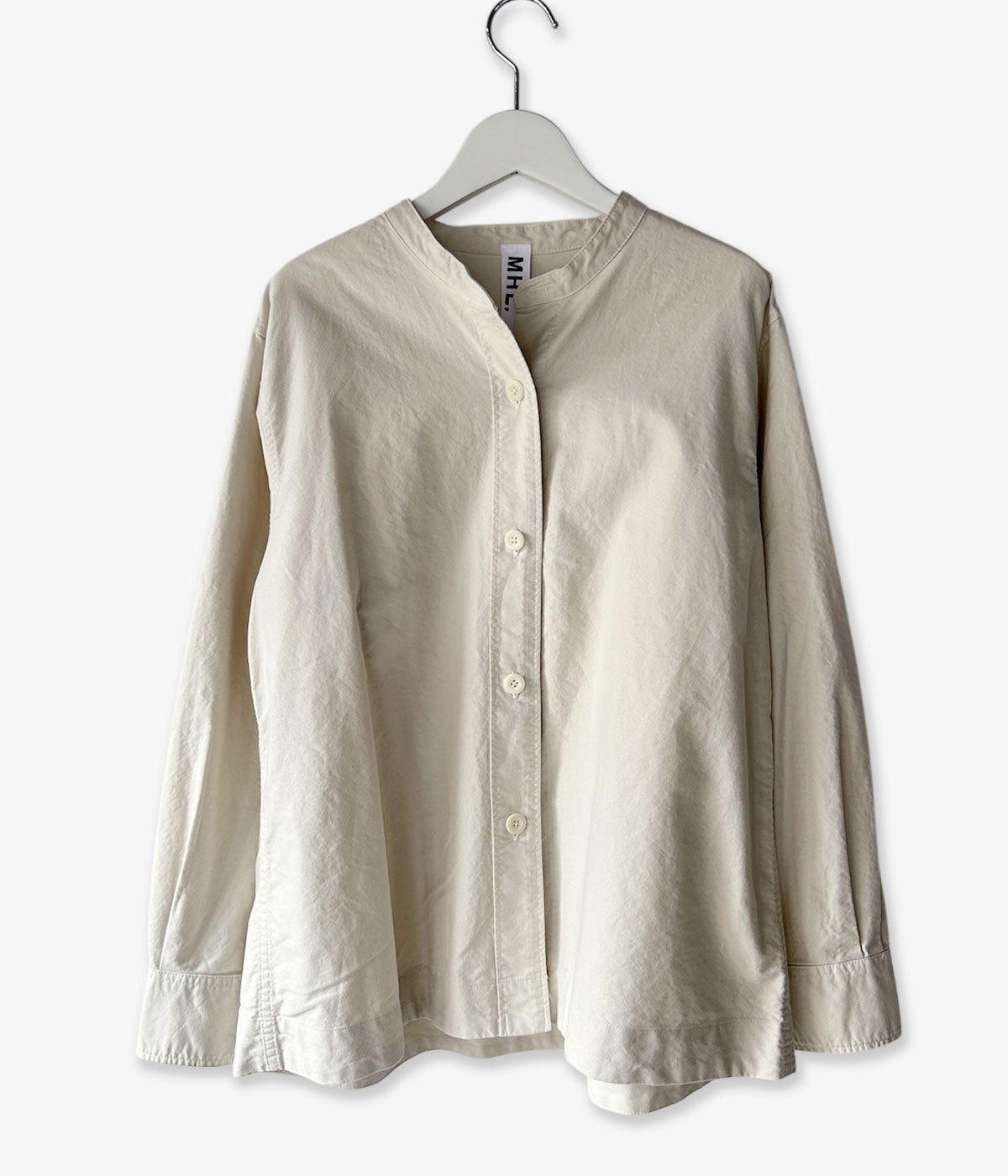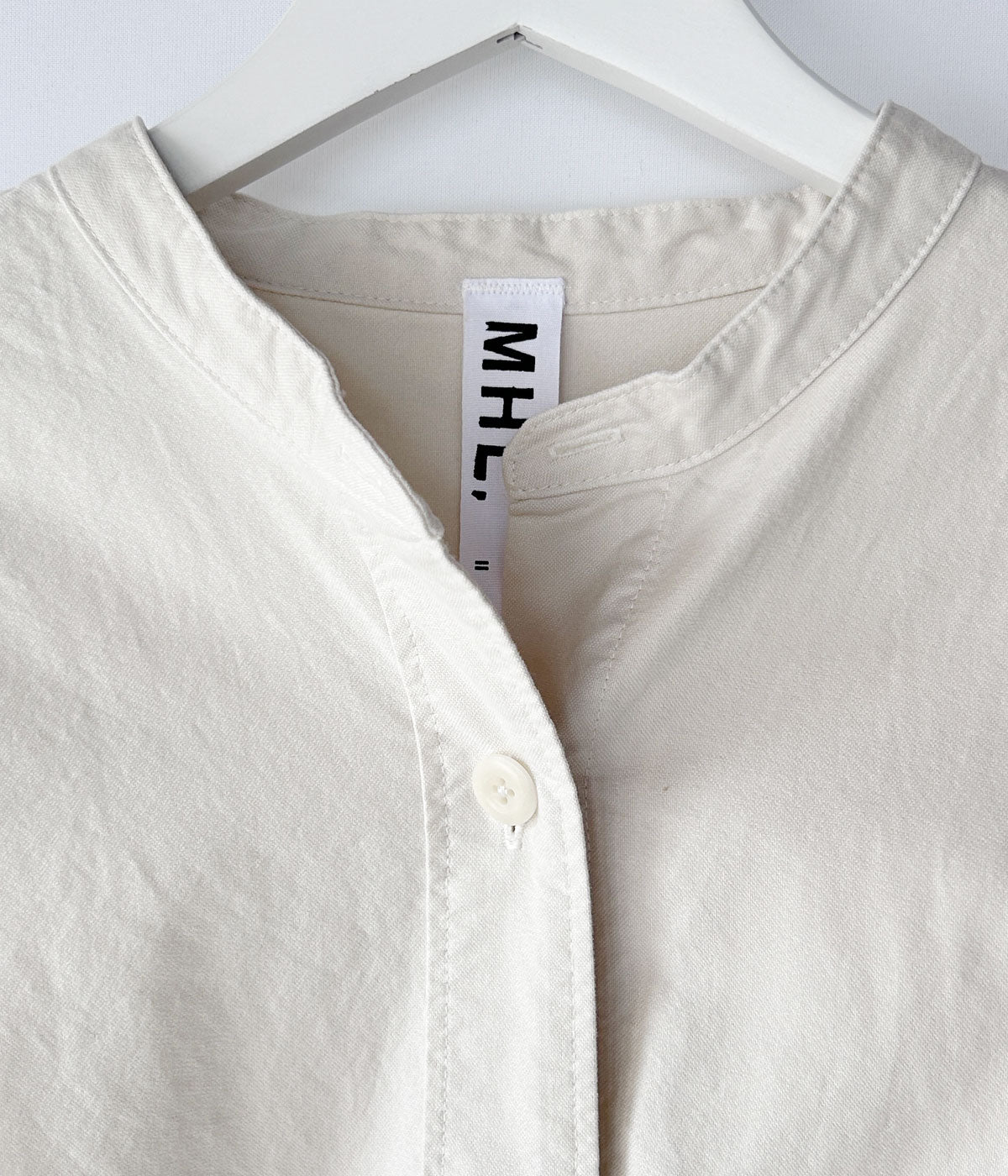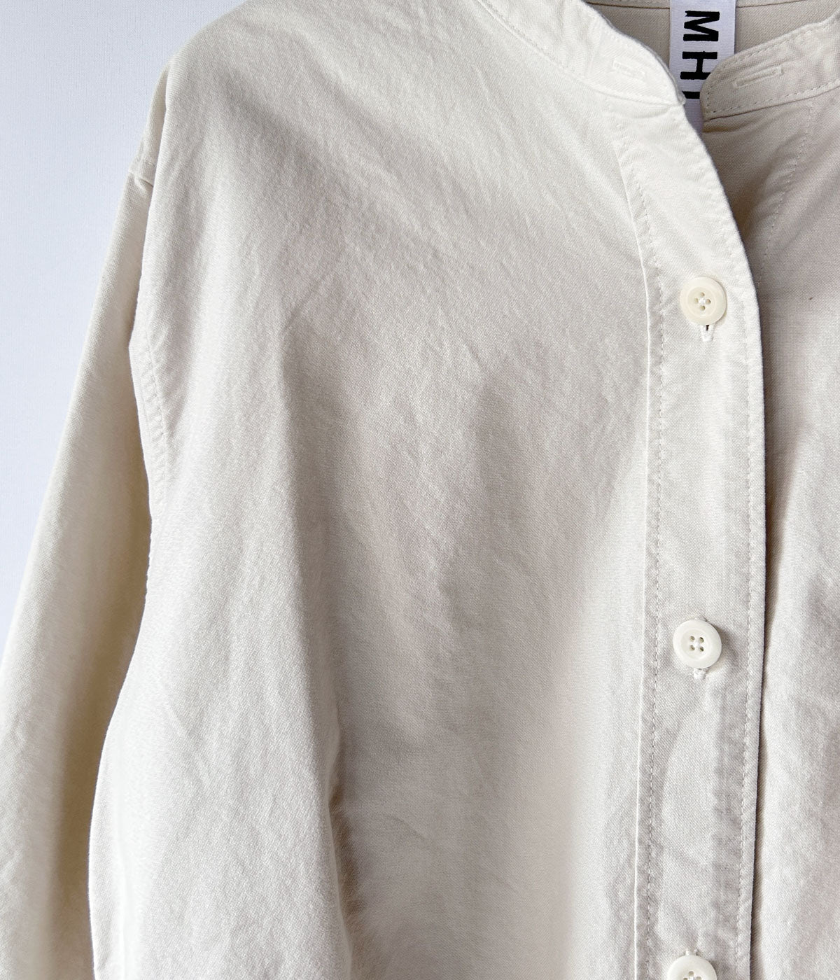 MHL.から、SOFT HOPSACK SHIRT WOMENSが入荷しました。厚手のコットンオックスに起毛加工を施したぬくもりのある質感が特徴のシャツ。スタンドカラー仕立てに、太めの前立て、ゆとりのあるAラインシルエットに仕立てた1着。