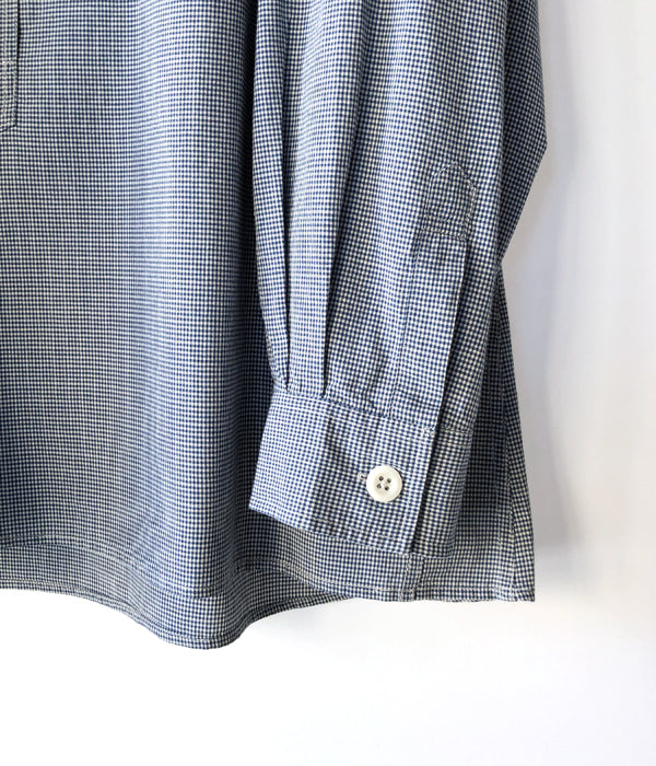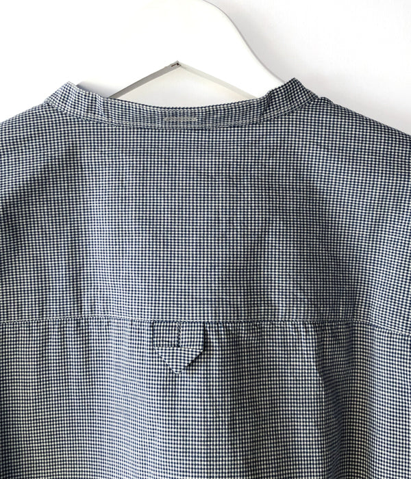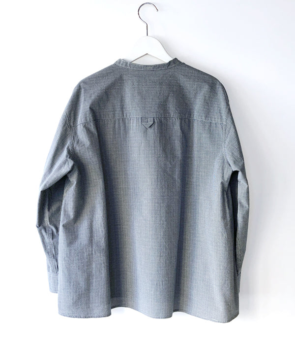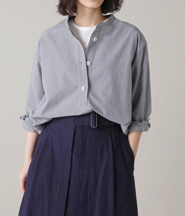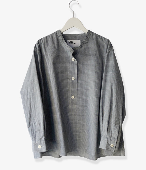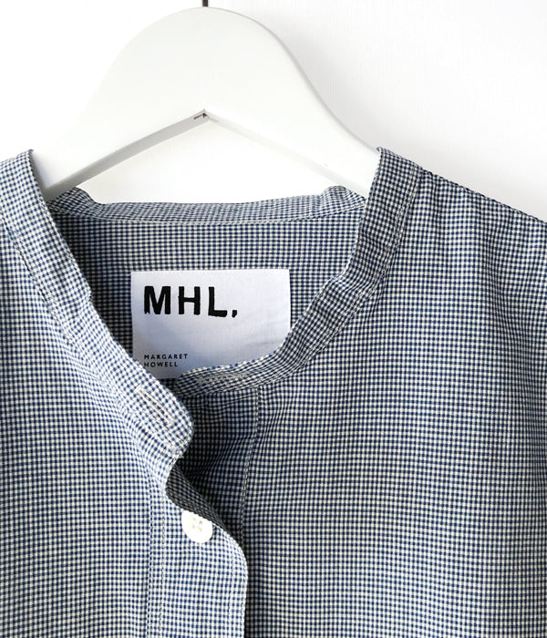 MHL.から、TINY GINGHAM COTTON SHIRT WOMENSが入荷しました。ブルーを基調とした細かなギンガムチェック柄のコットン製のシャツ生地を使用したスタンドカラーシャツ。大きめのボタンによるプルオーバー仕立て、存在感のあるカフスがポイントです。サイドタックの三角マチと前後異なる着丈がアクセントを与えてくれます。