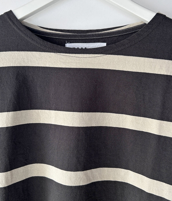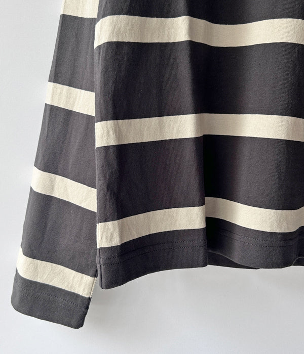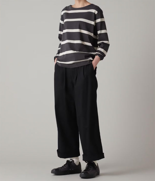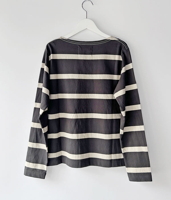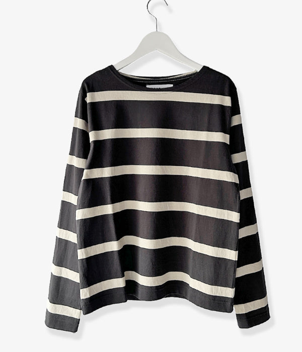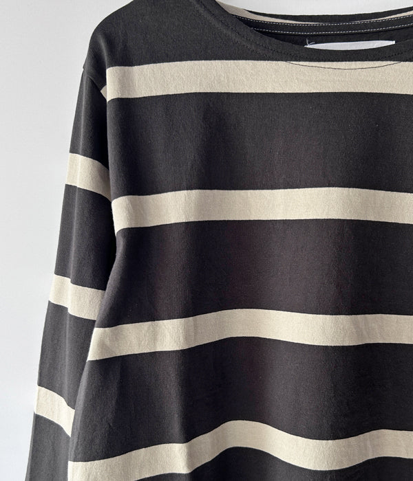 MHL.から、WIDE STRIPE DRY JERSEY LS WOMENSが入荷しました。ドライタッチなコットン生地を使用したボーダーロングスリーブTシャツ。幅広のボーダー柄と控えめな開きのボートネックが特徴。適度な伸縮性もあり着心地もよく、スタイルを選ばず使い勝手の良い汎用性の高さが光る1着。