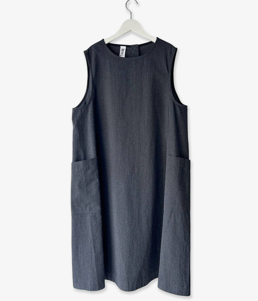 MHL.から、WOOL COTTON TWILL DRESSが入荷しました。ウールとコットンを高密度に織り上げたツイル素材を使用し、裾に向かって広がるテントラインに仕立てたノースリーブドレス。パネル切り替えで構成したパターンに、大きな腰ポケットや後ろのボタンフライがアクセント。アームホールを広めに設計しているので幅広くインナーとのレイヤリングを楽しめます。