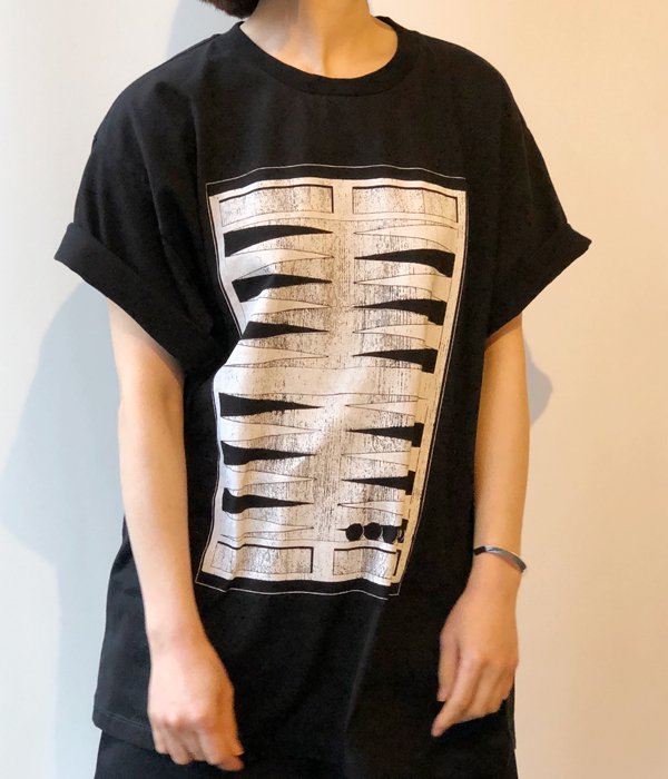 世界最古のボードゲームとされる"バックギャモン"がプリントされたS/S TEE。さり気なく駒に記された6の数字がデザインのポイント。規則的な盤の模様とカラーリングで、モードな雰囲気に仕上げています。