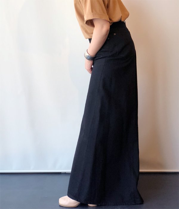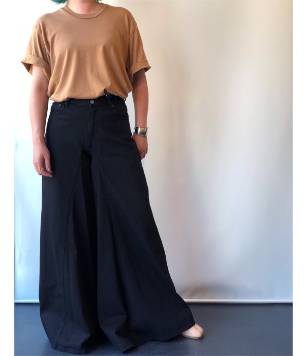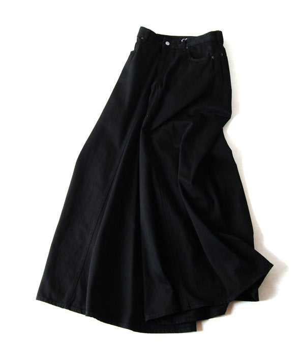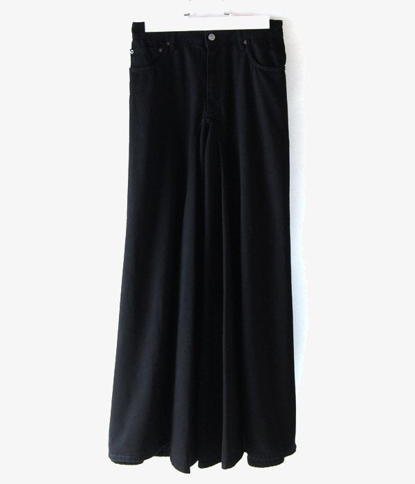 裾に向かうにつれスーパーワイドに広がり、袴を彷彿とさせるシルエットのデニムパンツ。柔らかくVintage感あるブラックデニム地でオールシーズン楽しめます。カジュアルなジーンズもマルジェラに掛かるとモードな雰囲気に。