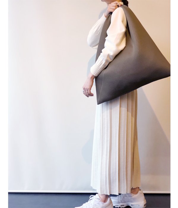風呂敷から着想のJAPANESE TOTE BAG。メッシュ素材を使用し軽量ながら、A4サイズもすっぽり収納する大容量に。インナーポケットも完備し、底部のスナップボタンでフォルムを変えられる面白いデザイン。