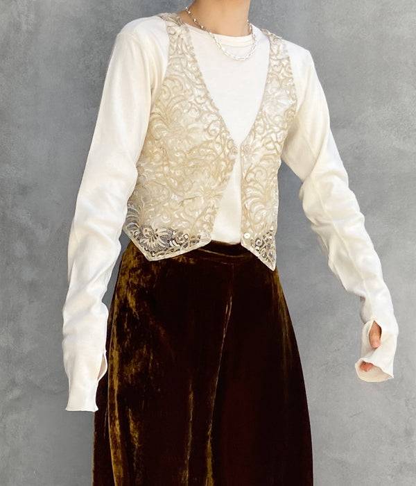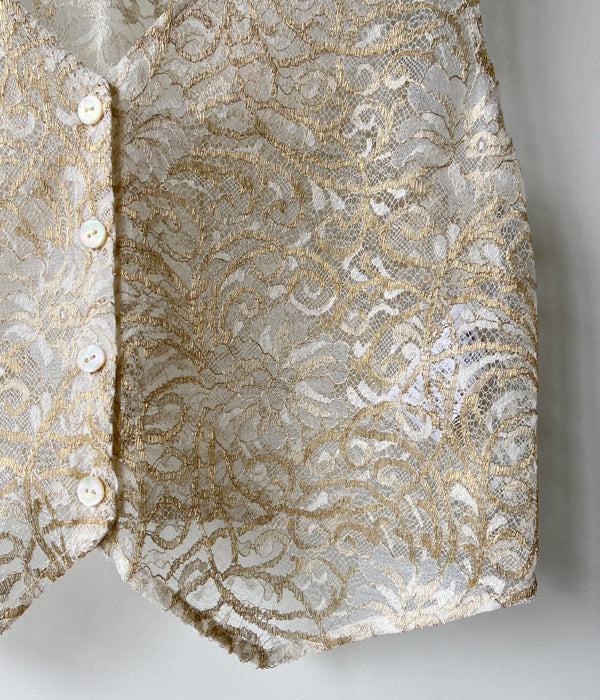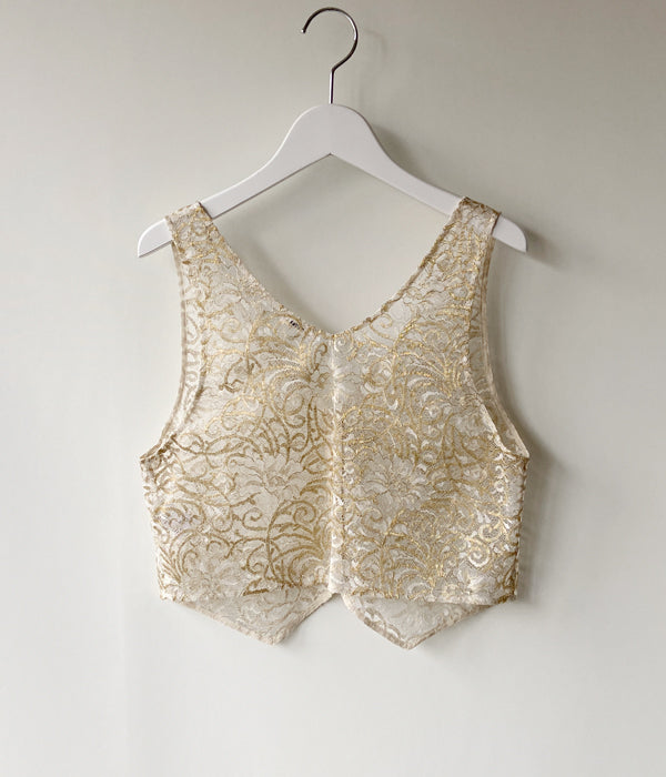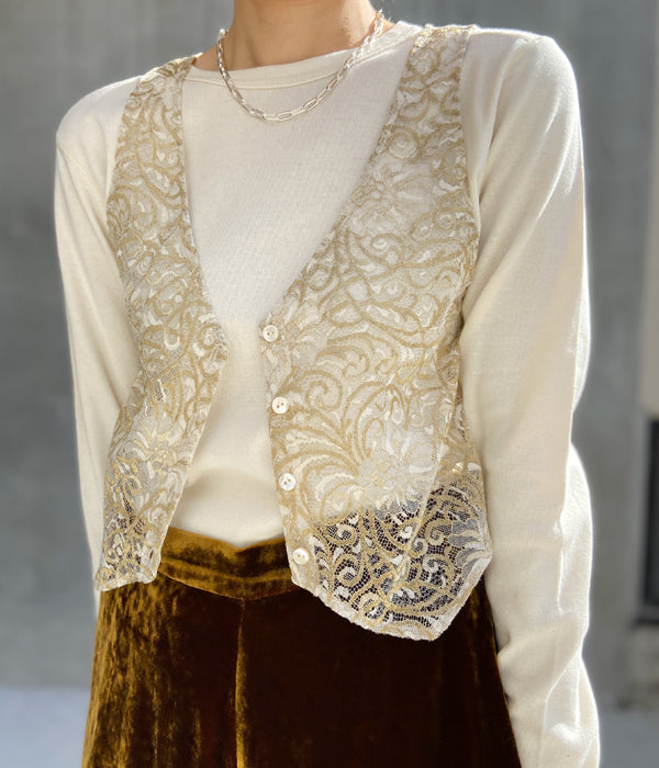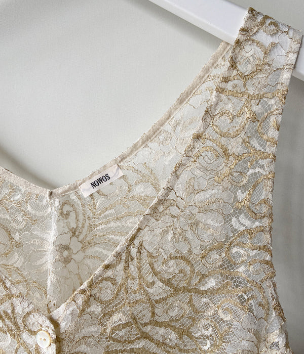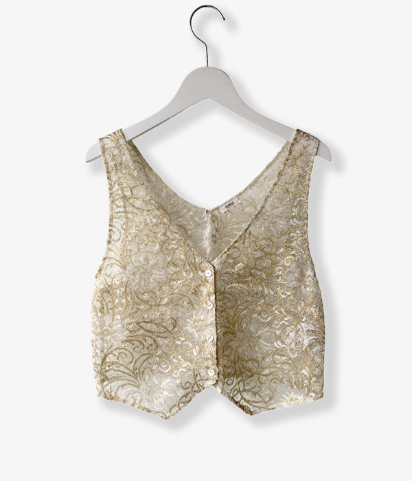 nowosからLACE BLOUSEが入荷しました。ゴールドの糸を使ったレースベスト。カジュアルな服装のプラスアイテムとして。アクセサリー代わりにもなる1枚。持っているとスタイリングの幅が広がります。