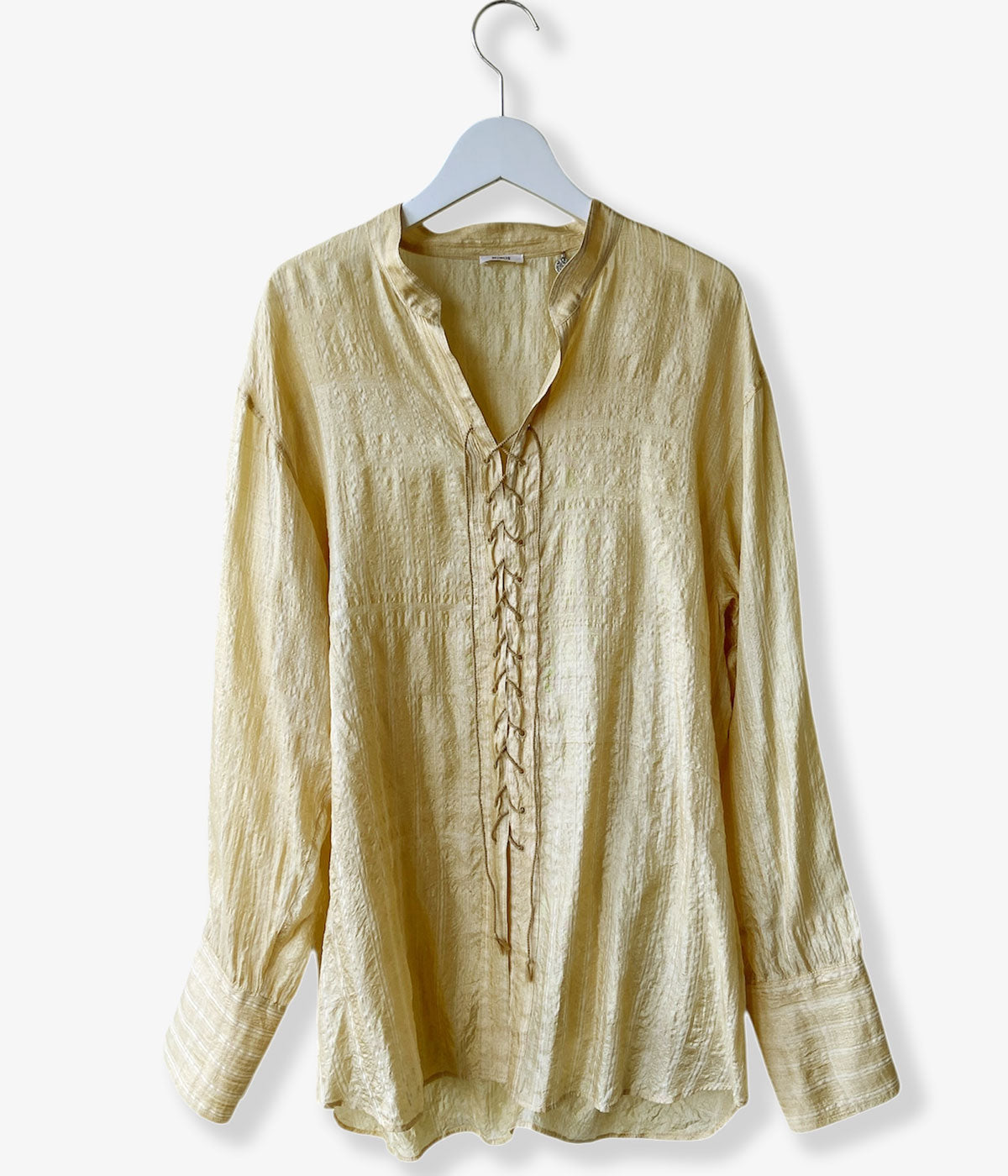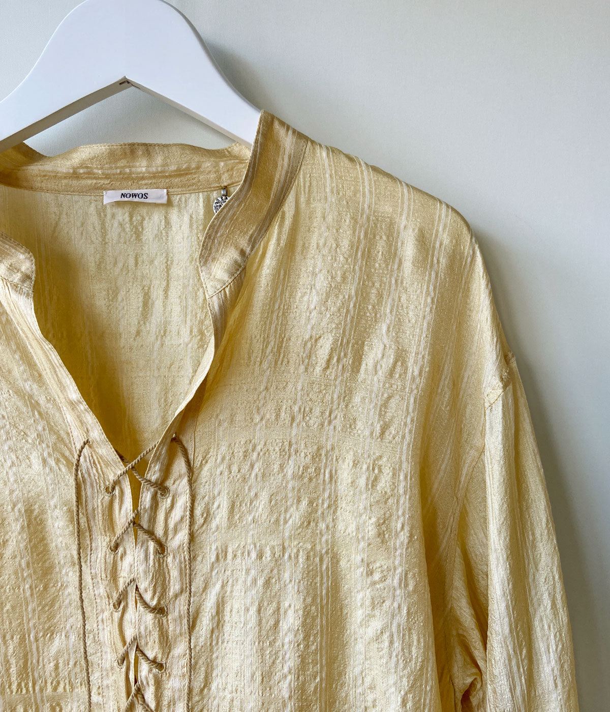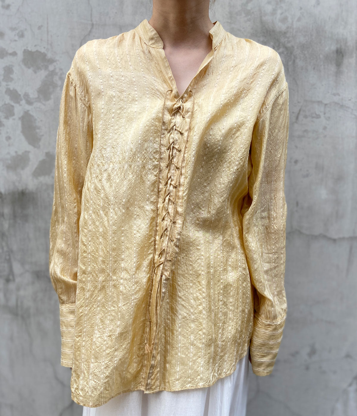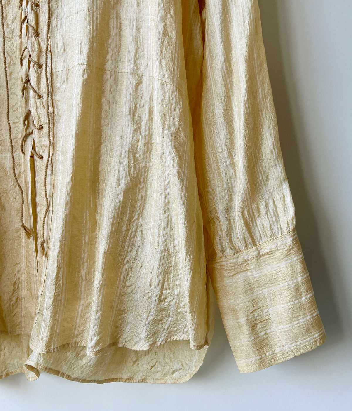 nowosからLACE UP SHIRTが入荷しました。コットンシルクでさらっとした着心地のレースアップシャツ。うっすらストライプのベージュカラーが大人の着こなしを楽しめます。ジャケットや羽織のインナーとしても活躍する一枚。