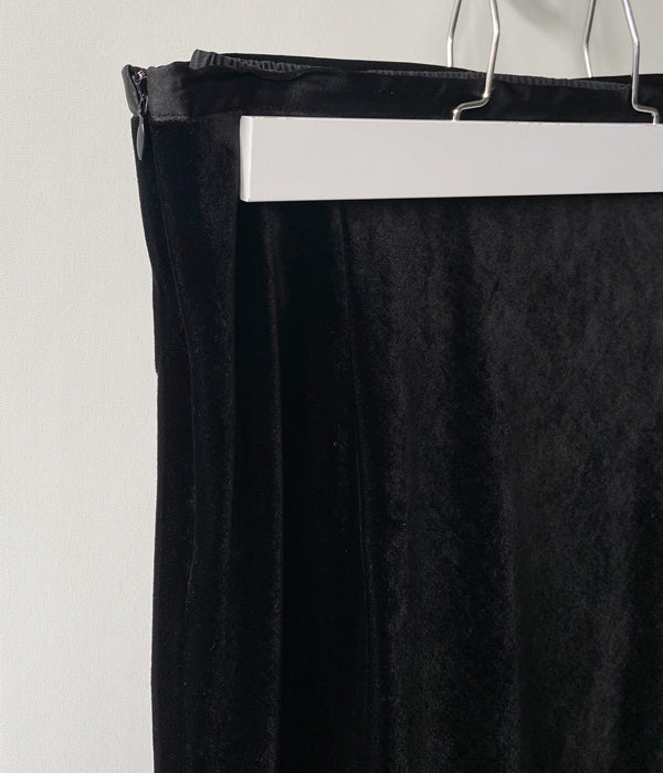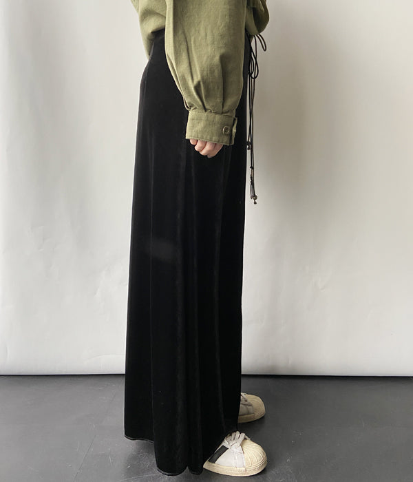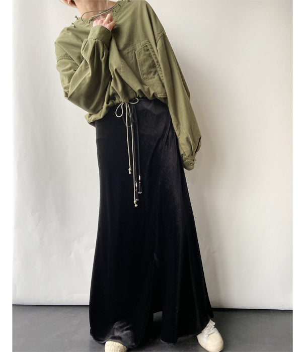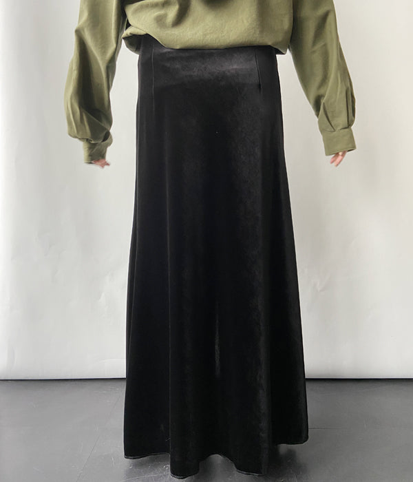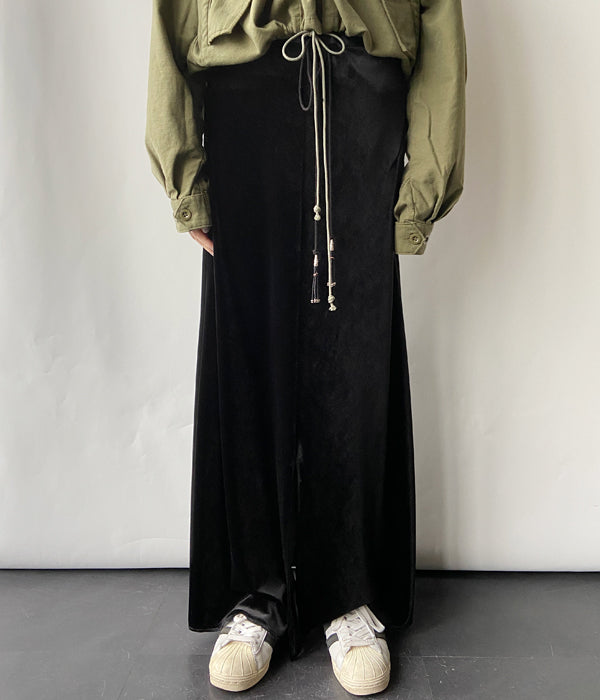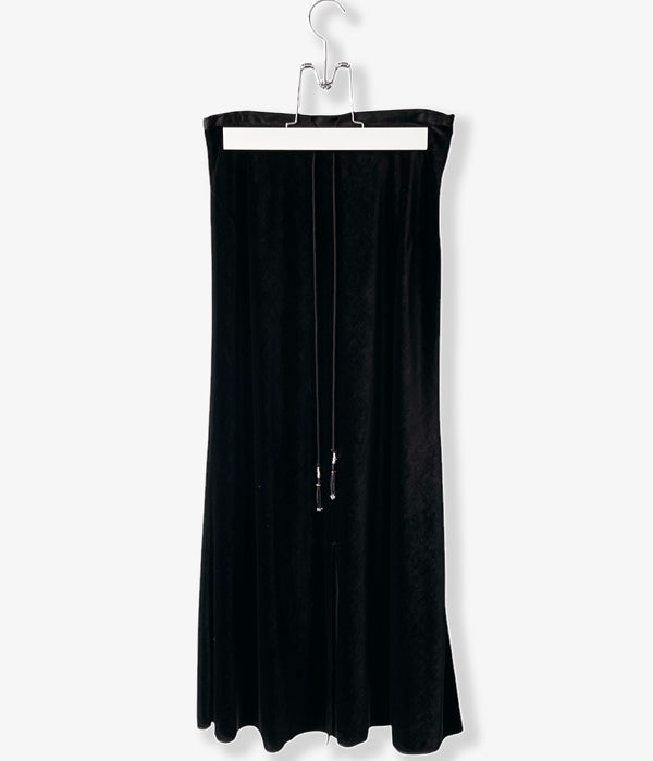 nowosからVELOUR SKIRTが入荷しました。滑らかなベロア生地のロングスカート。紐の先に付くコンチョがポイントに。美シルエットでスタイルアップ効果あり。カジュアルはもちろん、ドレスアップしたい時も使える万能スカートです。