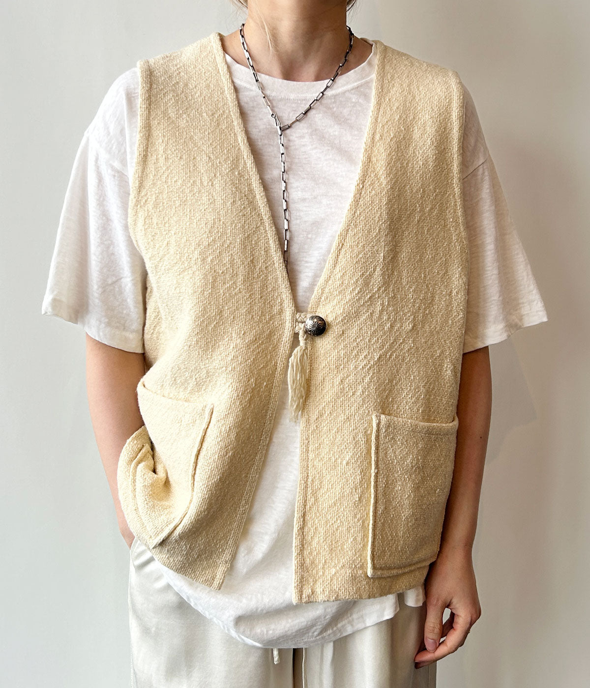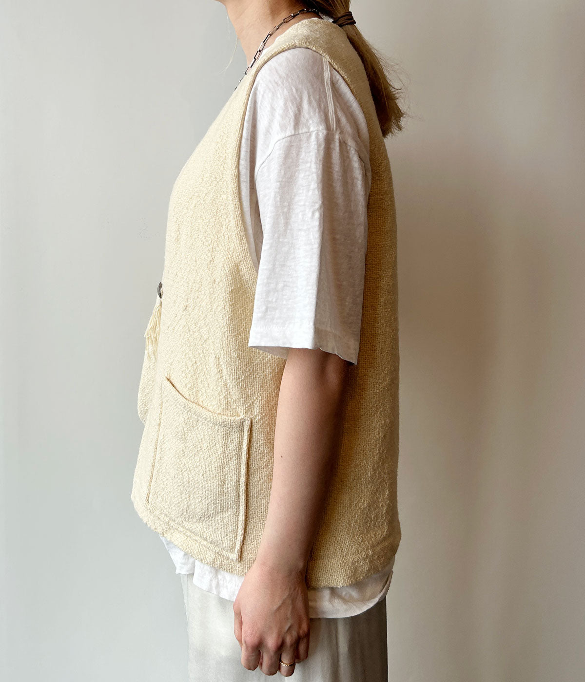 nowosからWHITE VESTが入荷しました。クリーンで洗練された印象が際立つホワイトベスト。上質なウールベース素材が生み出す、やわらかな風合いと軽やかな着心地が魅力です。ミニマルなデザインは、シャツやカットソー、ニットとのレイヤードにも自然に馴染み、スタイリングに奥行きをプラス。シーズンを問わず取り入れやすく、デイリーからきれいめスタイルまで幅広く活躍する一着です。
