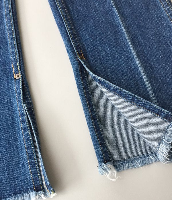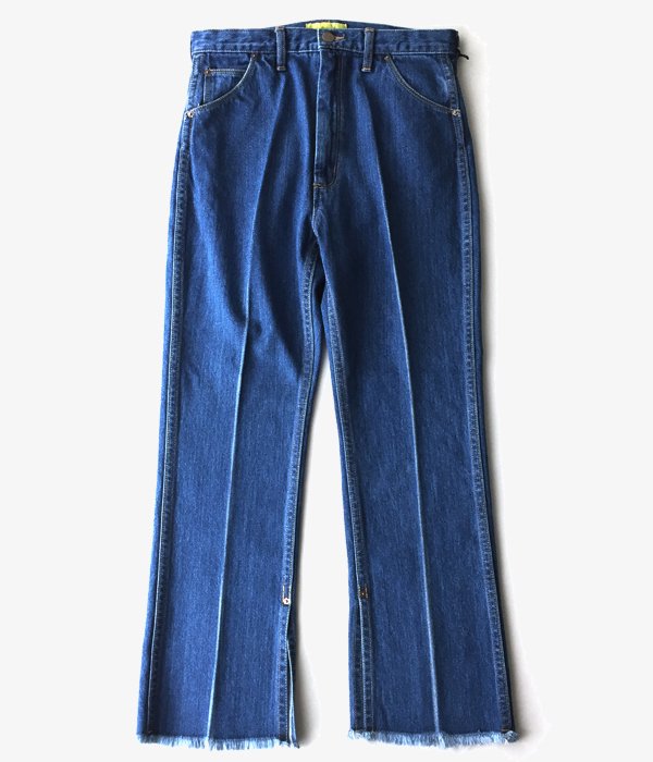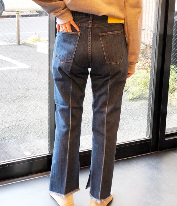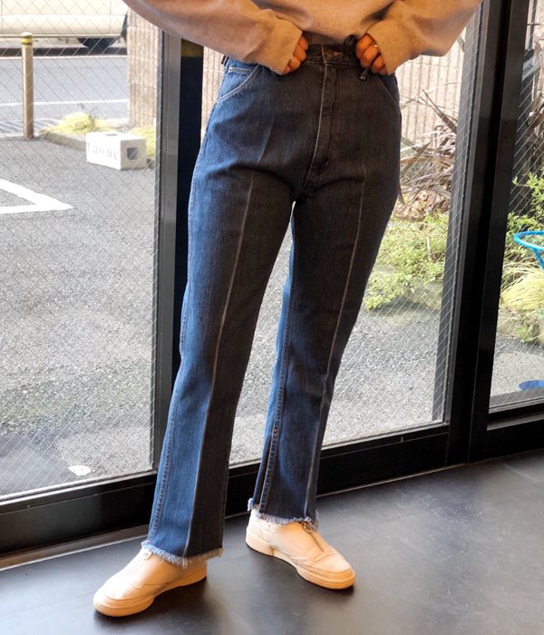 80年代のデニムによく見られるシボ感とフラット感が特徴のデニム。ヴィンテージ加工は児島の職人さんの手によるものです。ややフレアなシルエット、センタープレスで脚長&美脚効果もあり、いつものデニムスタイルをより洗練された印象にしてくれます。裾の切りっぱなしやスリット、オリジナルの紙パッチなど細部にまで拘った一本となっています。