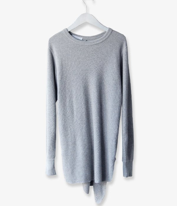 オリジナルのサーマル素材を使用の後身頃にデザインが入ったクルーネックロングスリーブ。スリットとドレープで女性らしさを表現しています。インナーにチューブトップやバンドゥを取り入れてヘルシーな着こなしを。