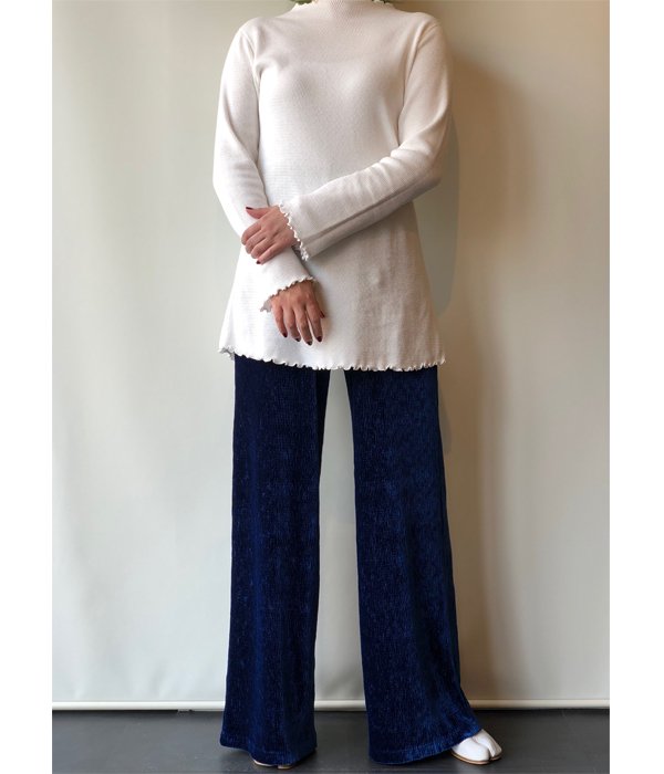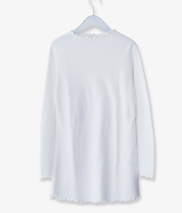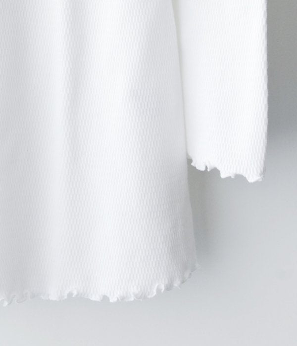 衿・裾・袖口にフリルを施したハイネックロングスリーブ。ヒップが隠れるミドル丈でウエストを少しだけシェイプさせ女性らしいラインに仕上がっています。オリジナルのサーマル素材を使用。