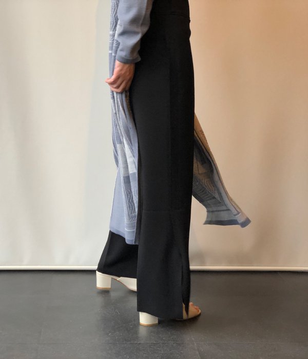 PHEENYからAMUNZEN SIDE STRIPE PANTSが入荷しました。ランダムな凸凹とシボ感のあるオリジナルのアムンゼン生地を使用。裁ち切りのディテール、ドレスパンツに見られるセンタープレスや側章風のデザインがポイントです。セミフレアとサイドのベンツがシルエットを綺麗に見せてくれスラックスのようなムードの一本。