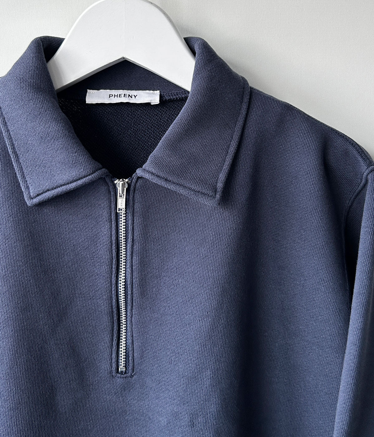 PHEENYからATHLEISURE HALF-ZIP COLLARED PULLOVERが入荷しました。リラックス感のあるシルエットが魅力の衿付きスウェット。フロントのファスナーは開き具合で印象を変えられる仕様。型崩れしにくく、速乾性も高い実用性のある一枚。風合いを引き出す加工でミニマルながらも存在感があります。