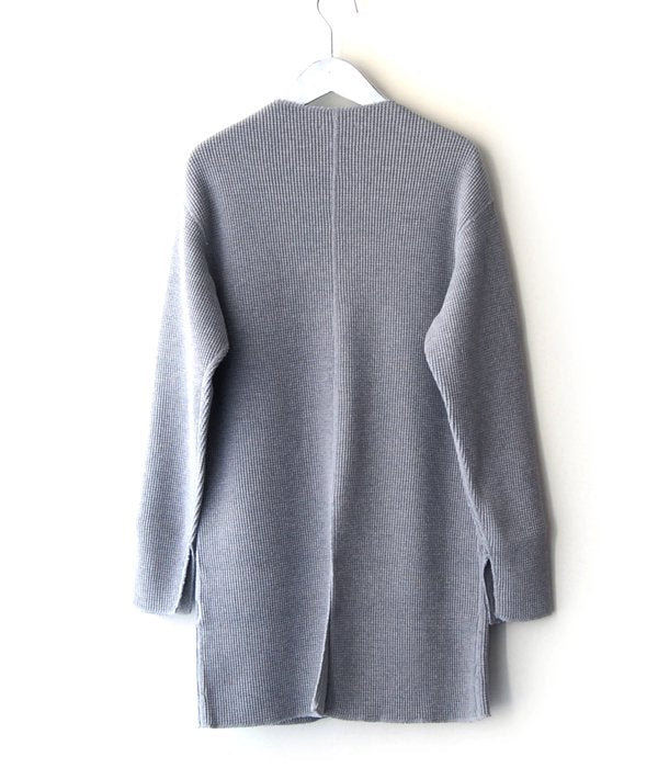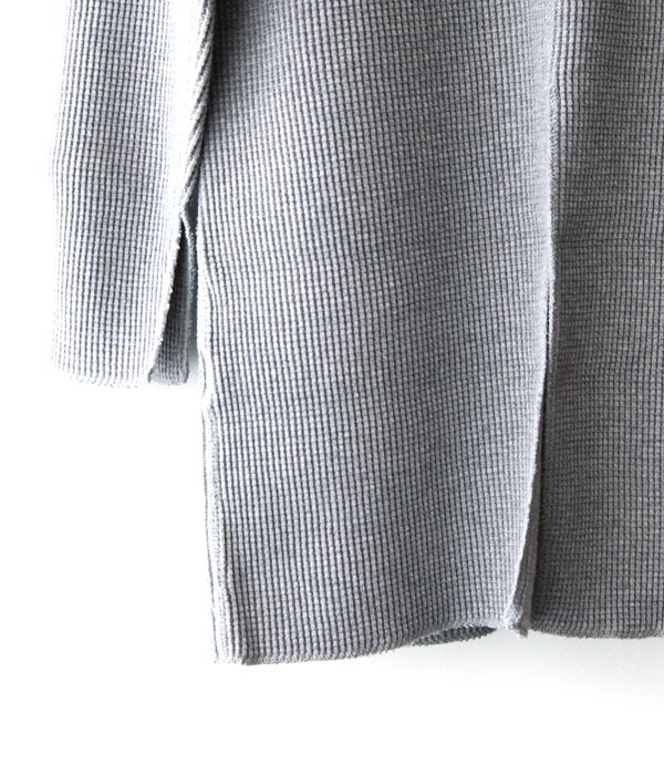 定番のオリジナルビッグワッフル素材を使用の、後裾と袖下にスリットが入ったハイネックロングスリーブ。ヒップが隠れるミドル丈でウエストを少しだけシェイプさせ女性らしいラインに仕上がりました。秋冬は生地の裏面に起毛加工をしている為、肌ざわりが良く温かみも感じられます。