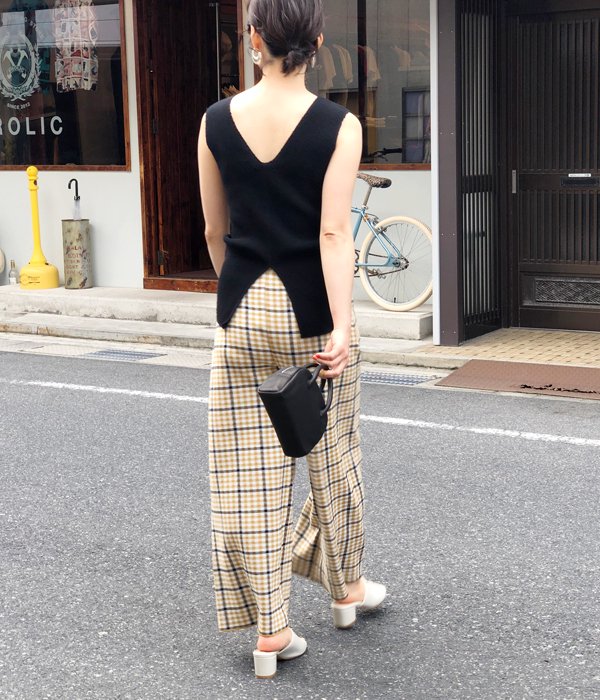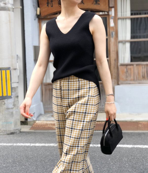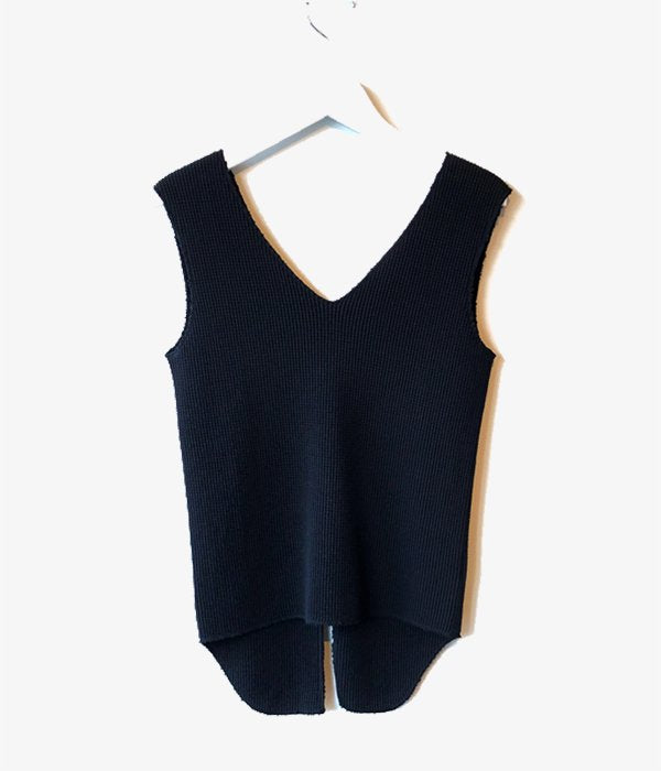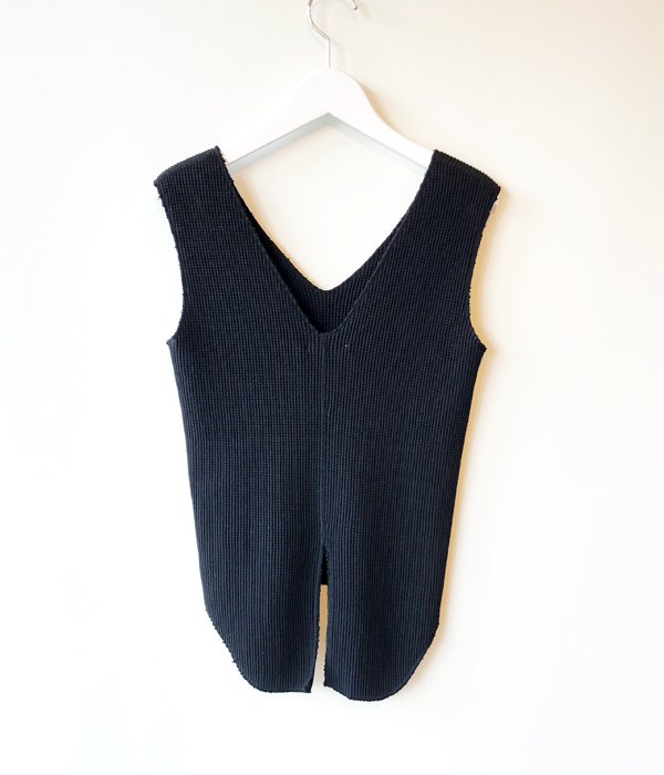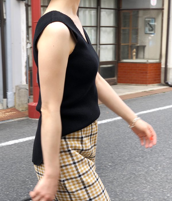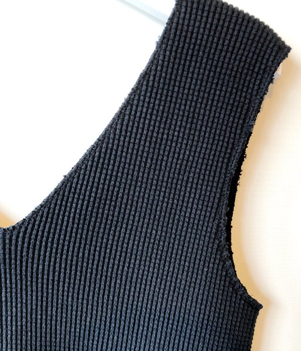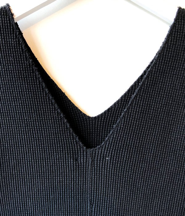 PHEENY定番の肉厚で度詰めなオリジナルビッグワッフル地を使用のVネックノースリーブ。前後のVラインの深さを変え、デコルテと背中が綺麗に見えるカッティングがポイント。程よいフィット感があり、アームホールからインナーが見えにくくなっていてヘルシーな肌見せができる一枚となっています。