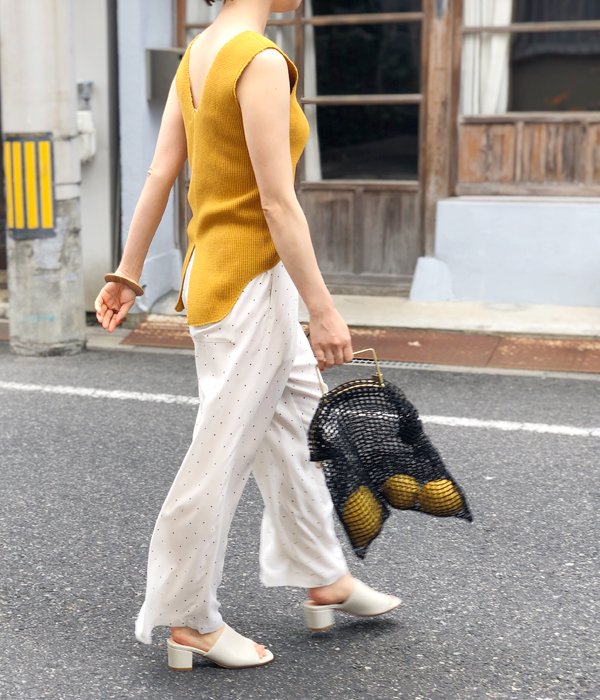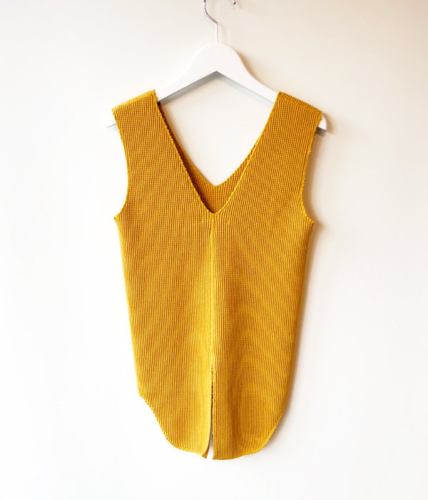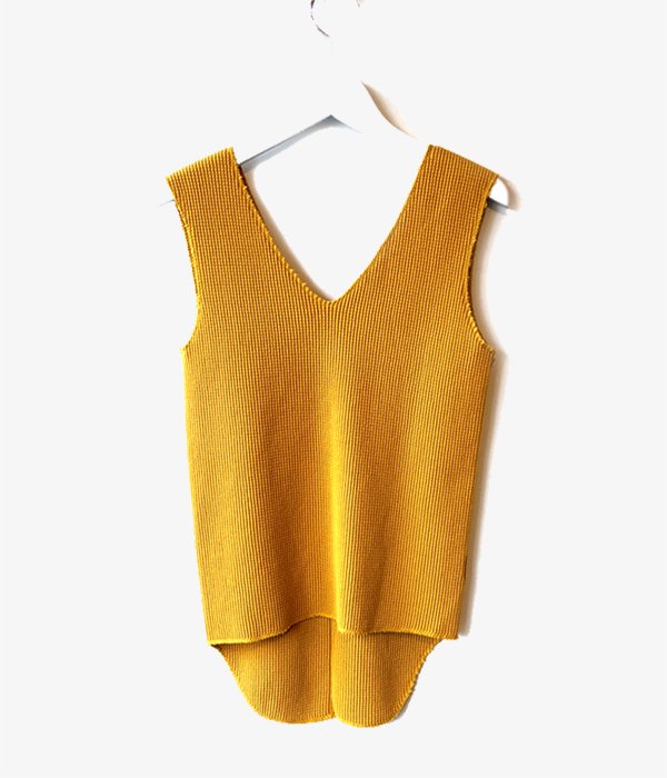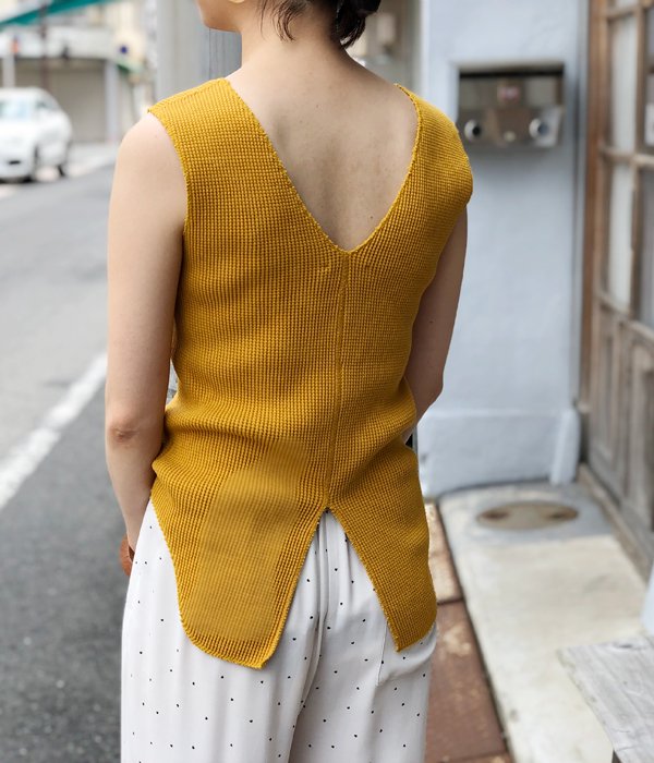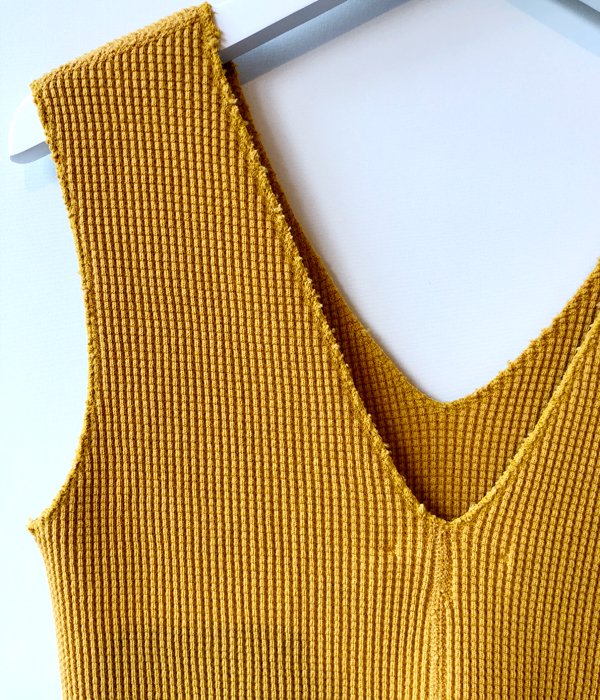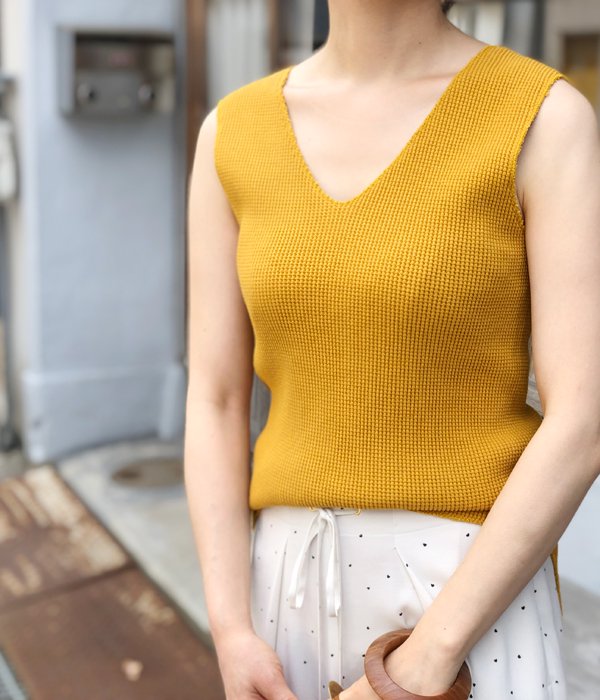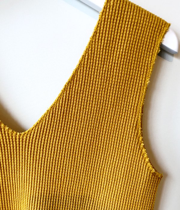 PHEENY定番の肉厚で度詰めなオリジナルビッグワッフル地を使用のVネックノースリーブ。前後のVラインの深さを変え、デコルテと背中が綺麗に見えるカッティングがポイント。程よいフィット感があり、アームホールからインナーが見えにくくなっていてヘルシーな肌見せができる一枚となっています。