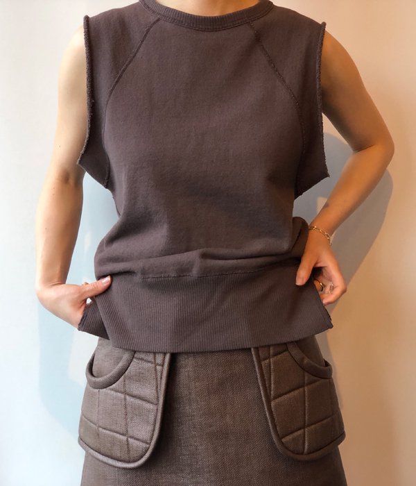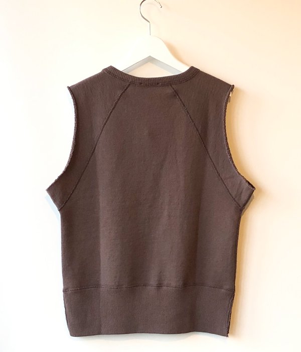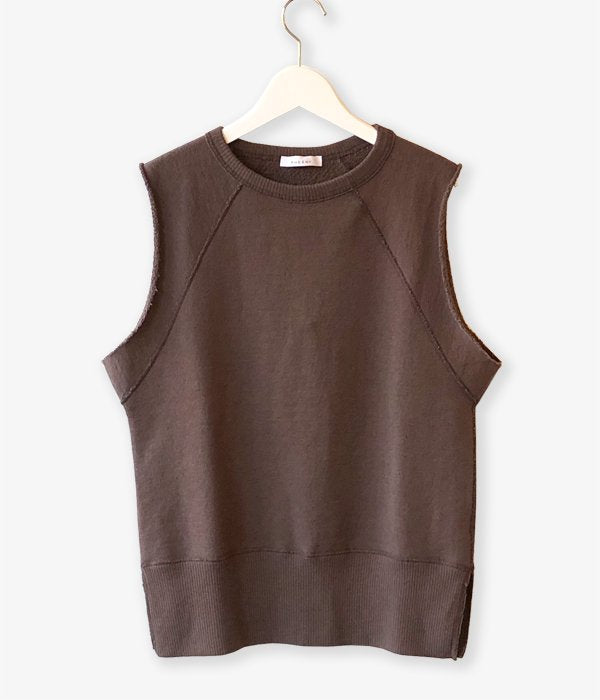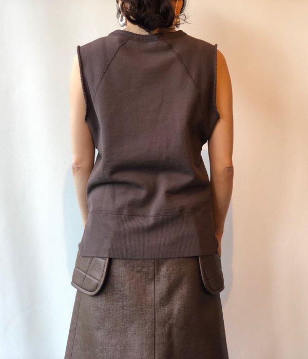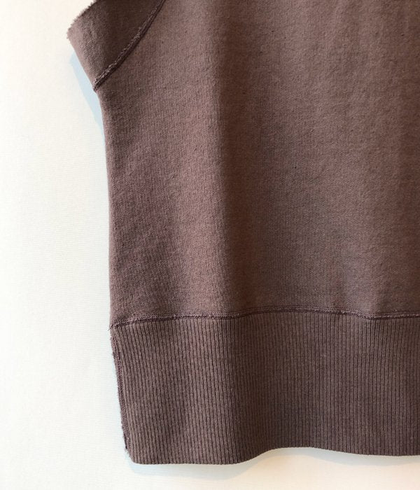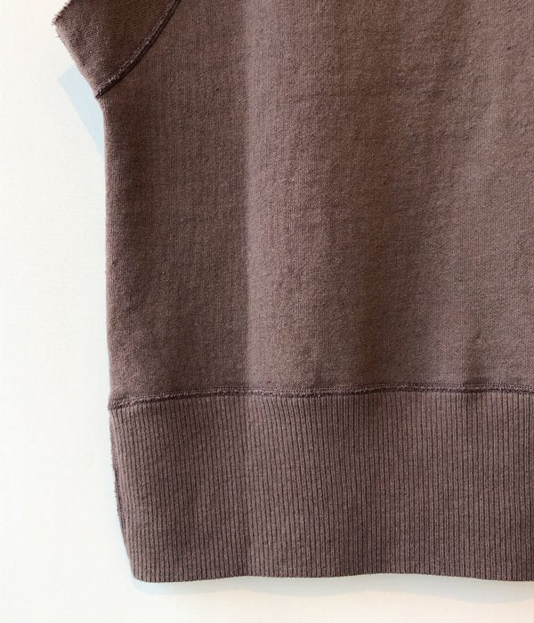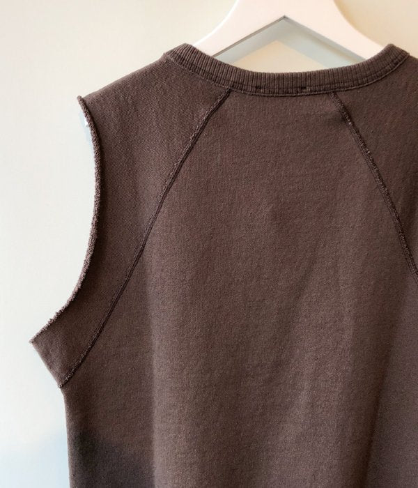 PHEENYからCUT OFF SWEAT SHIRT(BROWN)が入荷しました。1950~60年代にチャンピオンで使用されていた裏毛をオリジナルで再現した生地のノースリーブスウェット。ラグランスリーブでオーバーサイズのスウェットの袖をカットオフしてリメイクした古着を元に作られています。インナーが覗くくらい深めのアームホールが特徴的で女性らしいニュアンスのある仕上がりとなっています。