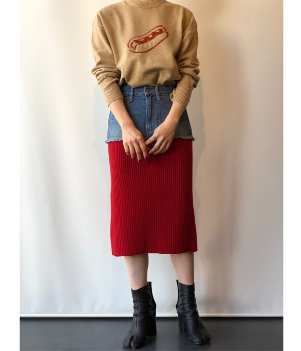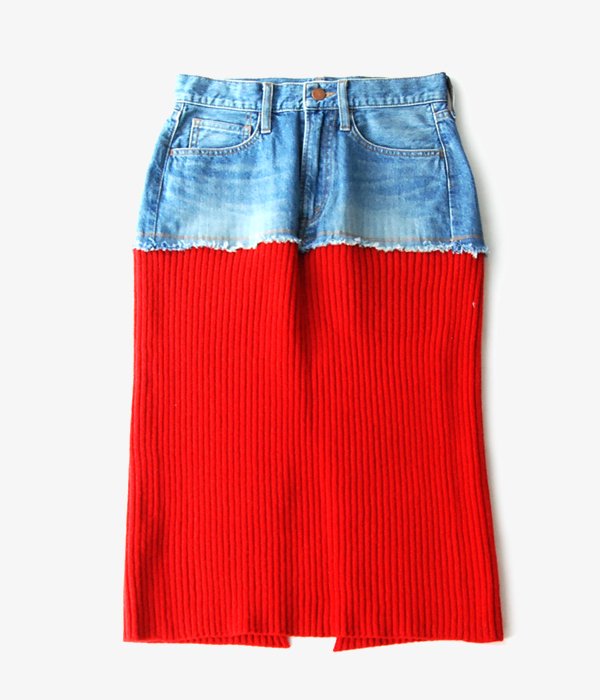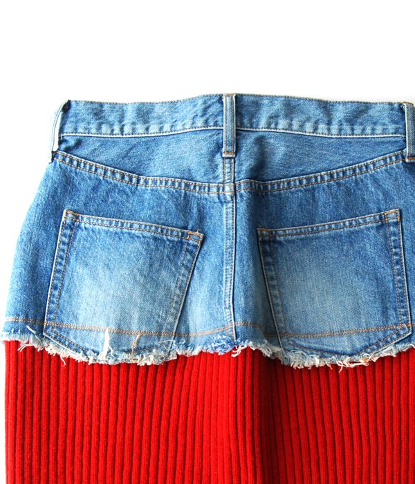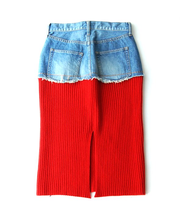 デニムパンツを縫製・加工した後に解体し、ニットをドッキングさせスカートに仕上げた非常に凝った一着。ヒップ部分がデニム素材でヒップのラインが響かずスタイル良く着ていただけます。ポップなカラーがポイントになるので、パーカーやニットなどカジュアルなトップスと相性◎
