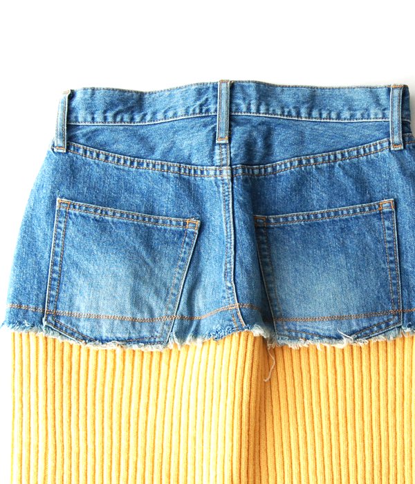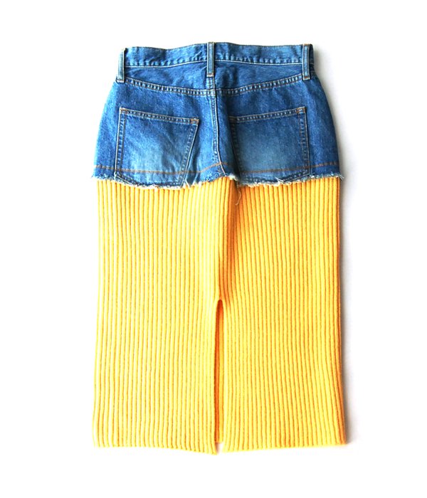 デニムパンツを縫製・加工した後に解体し、ニットをドッキングさせスカートに仕上げた非常に凝った一着。ヒップ部分がデニム素材でヒップのラインが響かずスタイル良く着ていただけます。ポップなカラーがポイントになるので、パーカーやニットなどカジュアルなトップスと相性◎