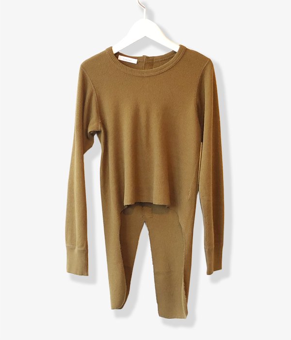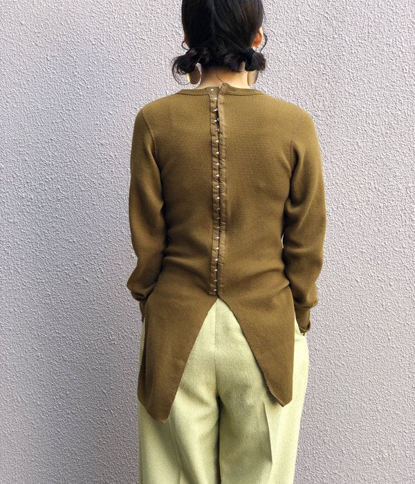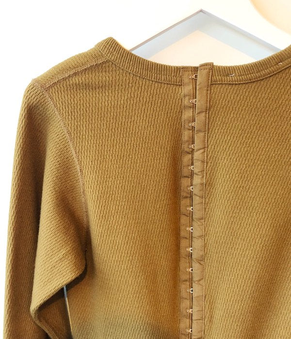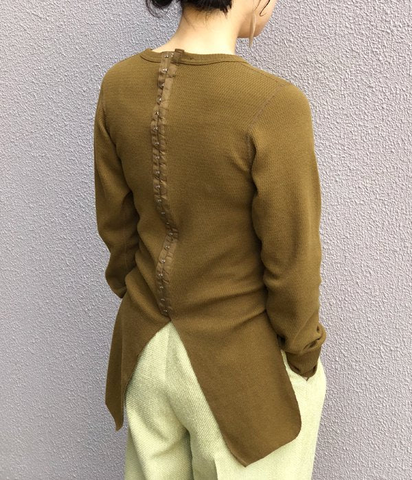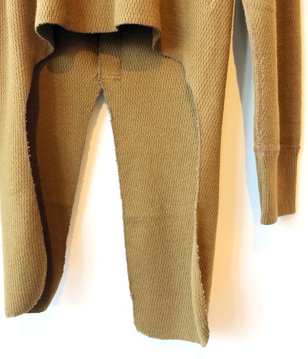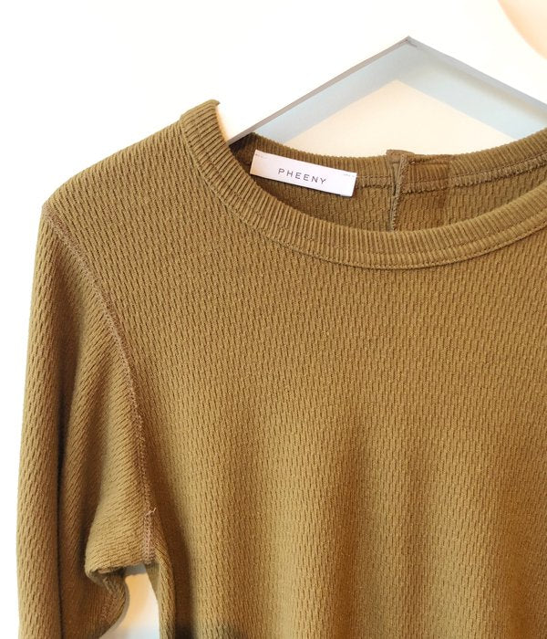 PHEENYからHONEYCOMB BACK HOOK TAPE L/S(OLIVE)が入荷しました。PHEENY定番のオリジナルハニカム素材を使用。表面はサラッと裏面は起毛加工で温かみのある柔らかい肌ざわりです。フロントはショート丈、バックはヒップが隠れる丈で燕尾服のような裾のデザインとバックスタイルのフックテープが特徴的です。すっきりとしたサイズ感でトップスインせずに着られるのも嬉しいポイント。