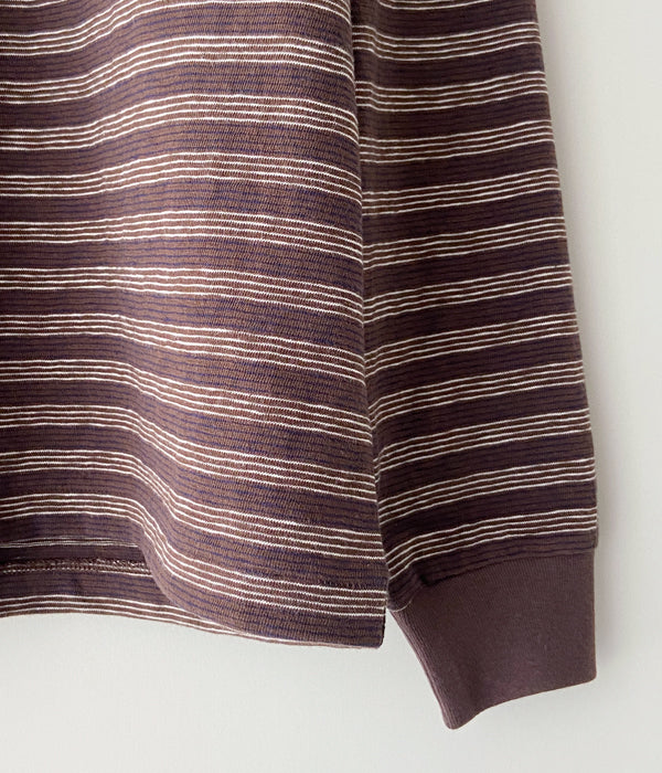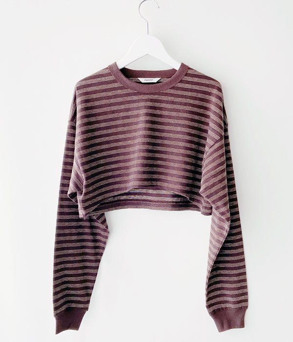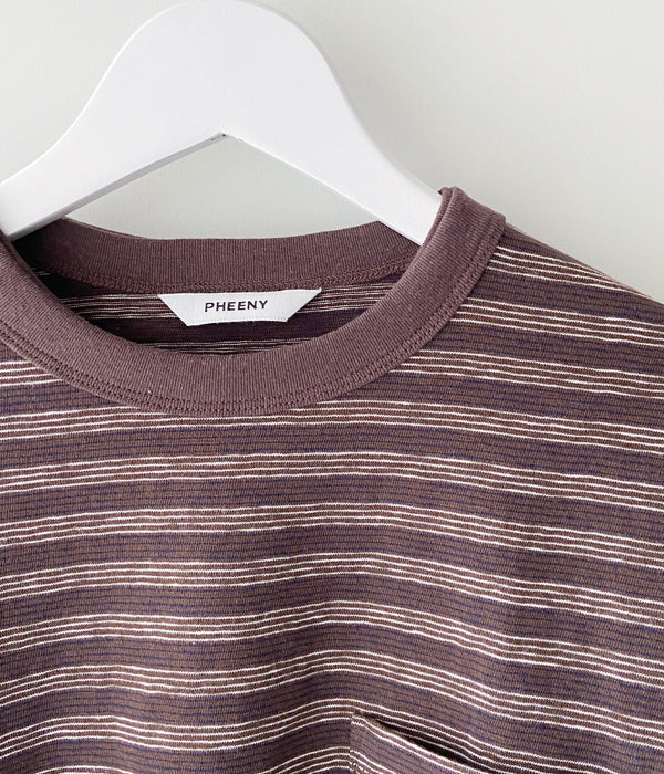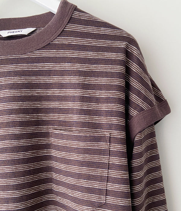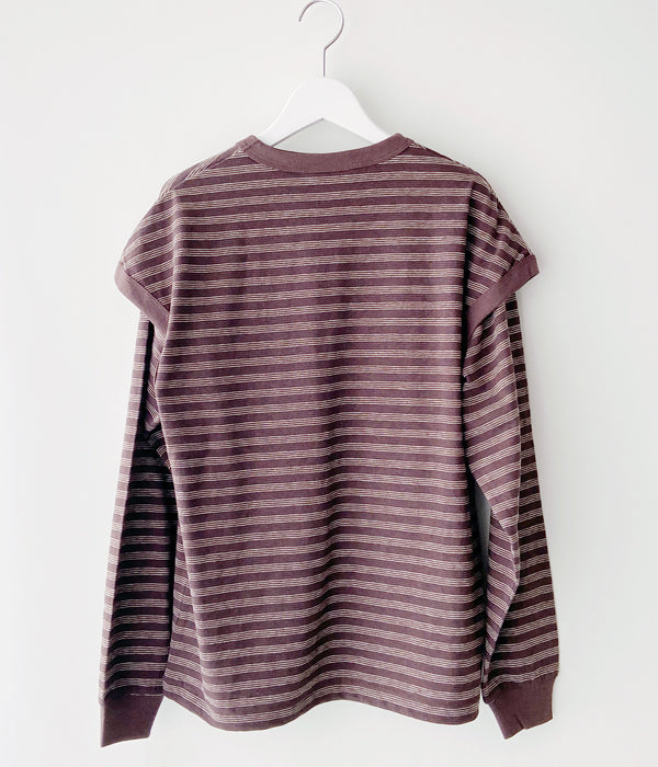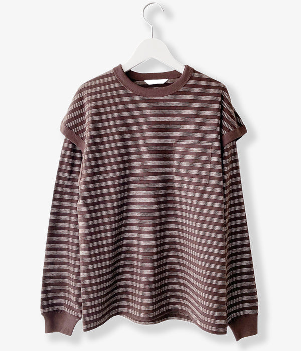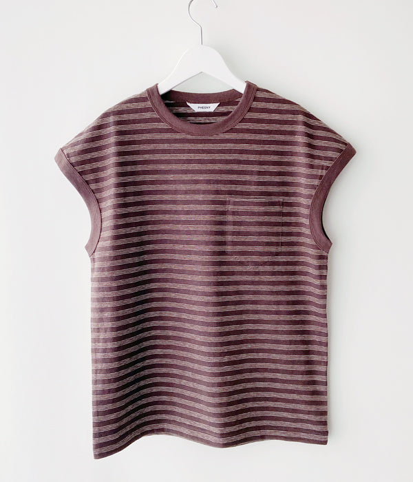 PHEENYからMULTI BORDER ENSEMBLEが入荷しました。フレンチスリーブとショート丈のロングスリーブとのアンサンブル。ロングスリーブはウエストで結んだり、肩から掛けたりとアレンジ自在。それぞれバラバラに着用しても。裏面に凹凸があり、清涼感と通気性に優れた一枚。手書きのようなミジンボーダーを表現しています。