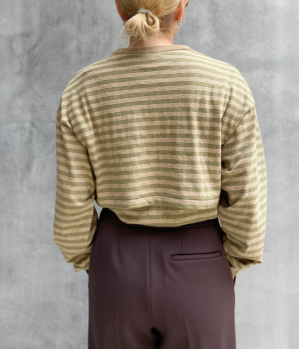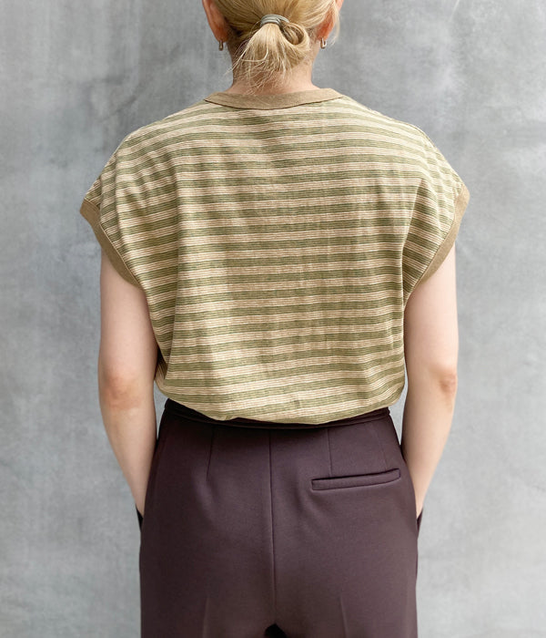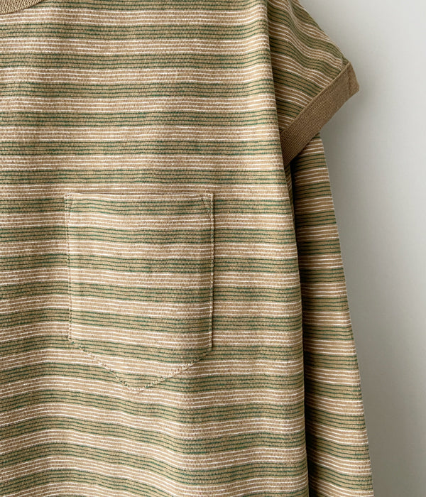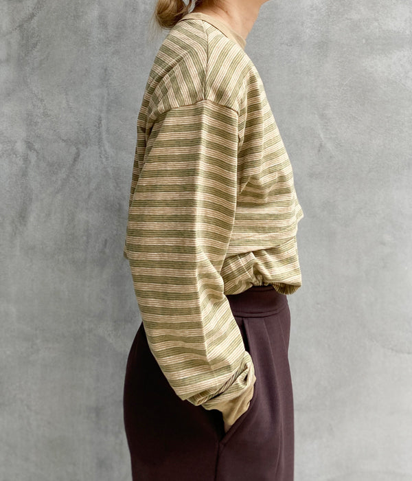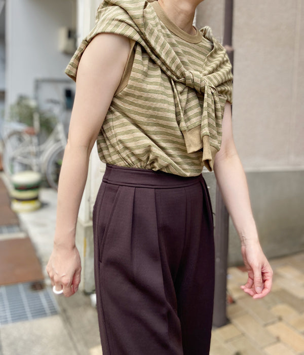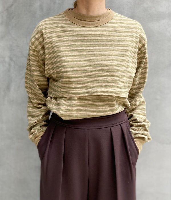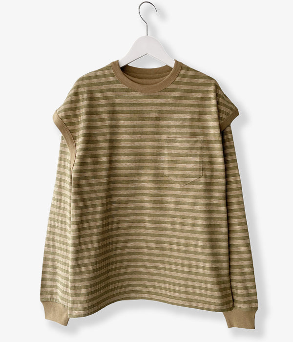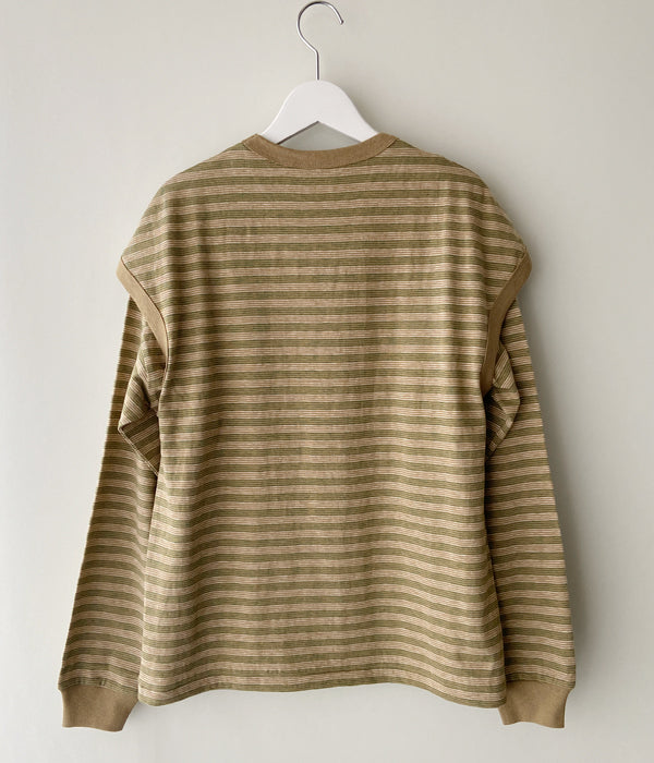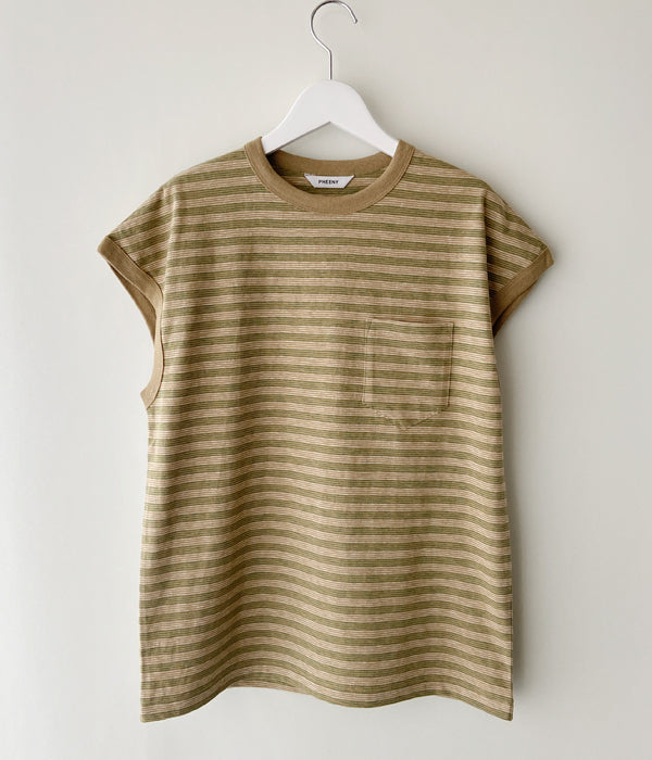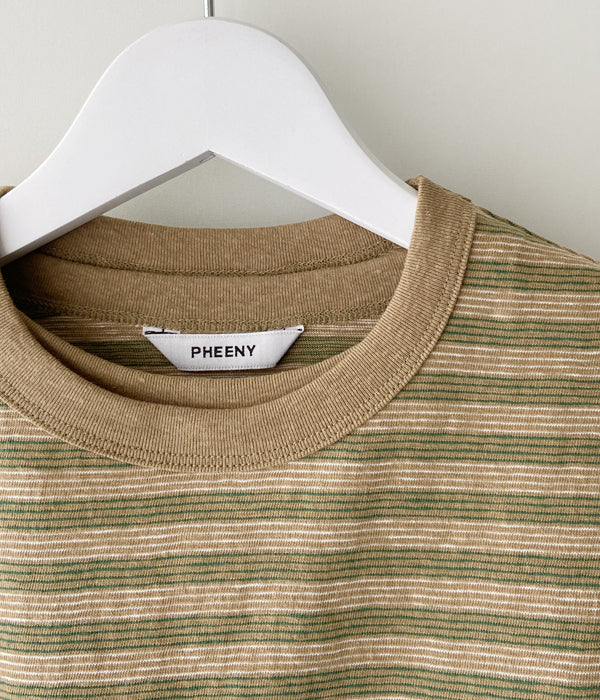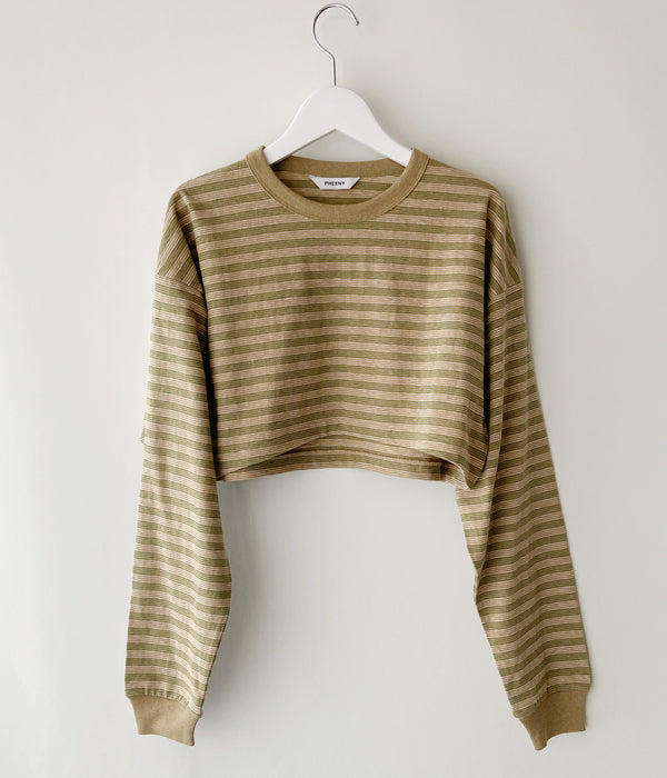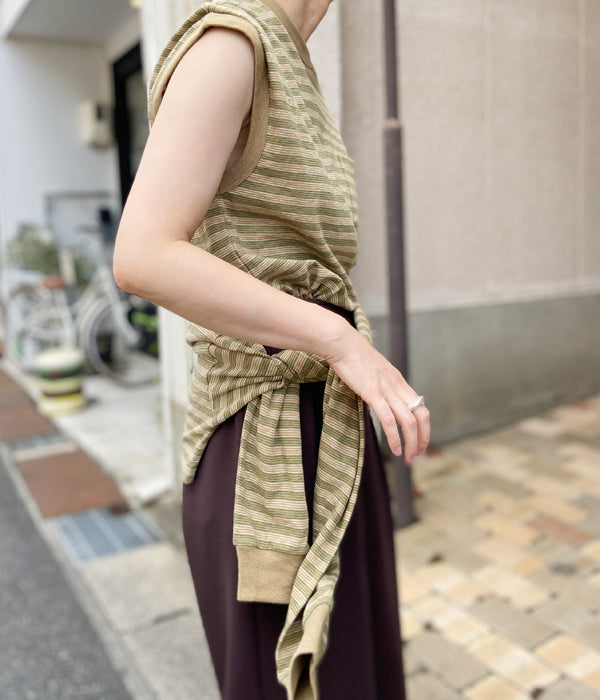 PHEENYからMULTI BORDER ENSEMBLEが入荷しました。フレンチスリーブとショート丈のロングスリーブとのアンサンブル。ロングスリーブはウエストで結んだり、肩から掛けたりとアレンジ自在。それぞれバラバラに着用しても。裏面に凹凸があり、清涼感と通気性に優れた一枚。手書きのようなミジンボーダーを表現しています。