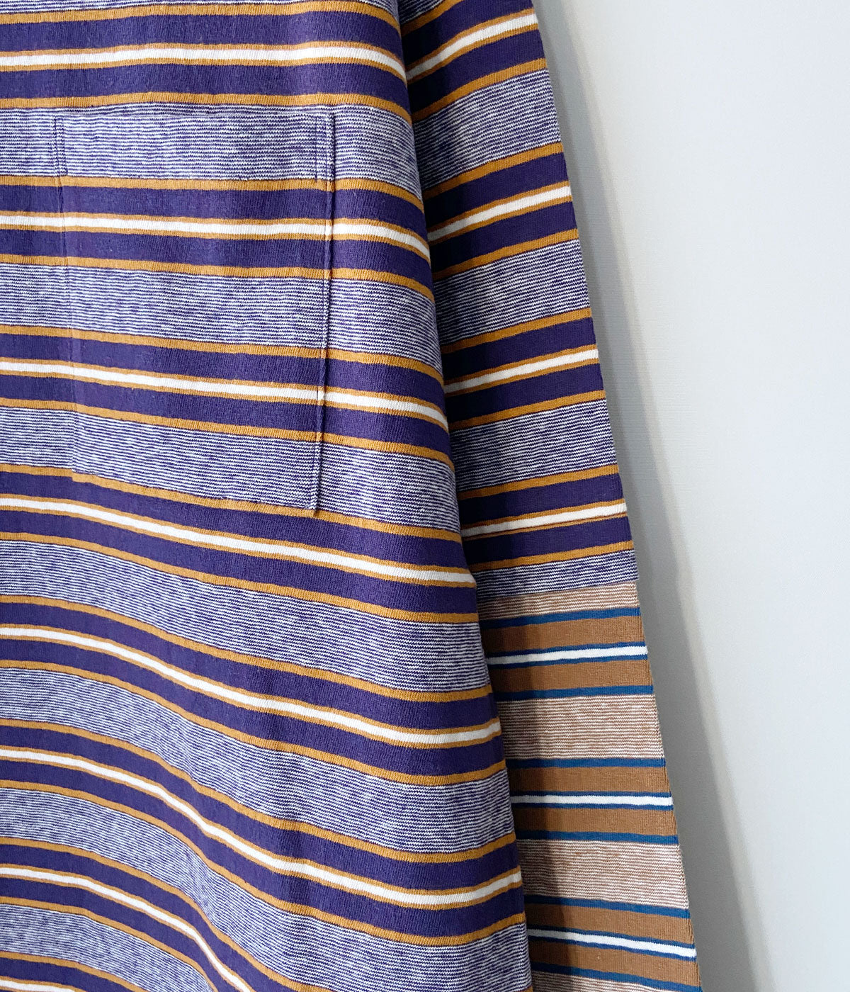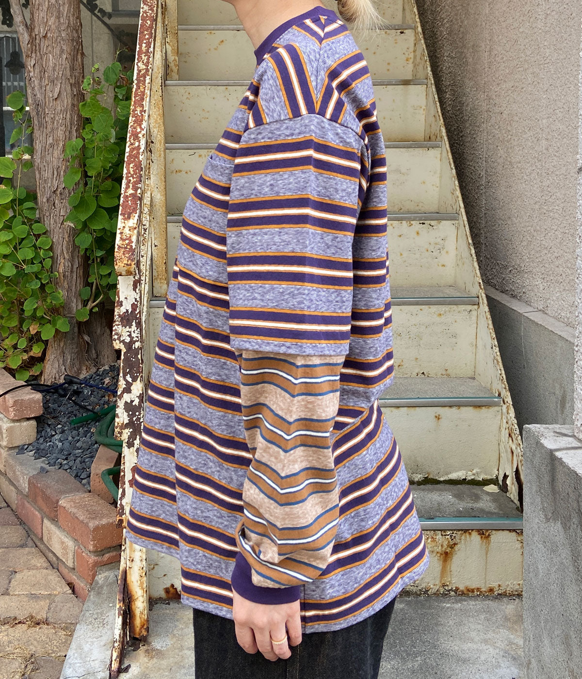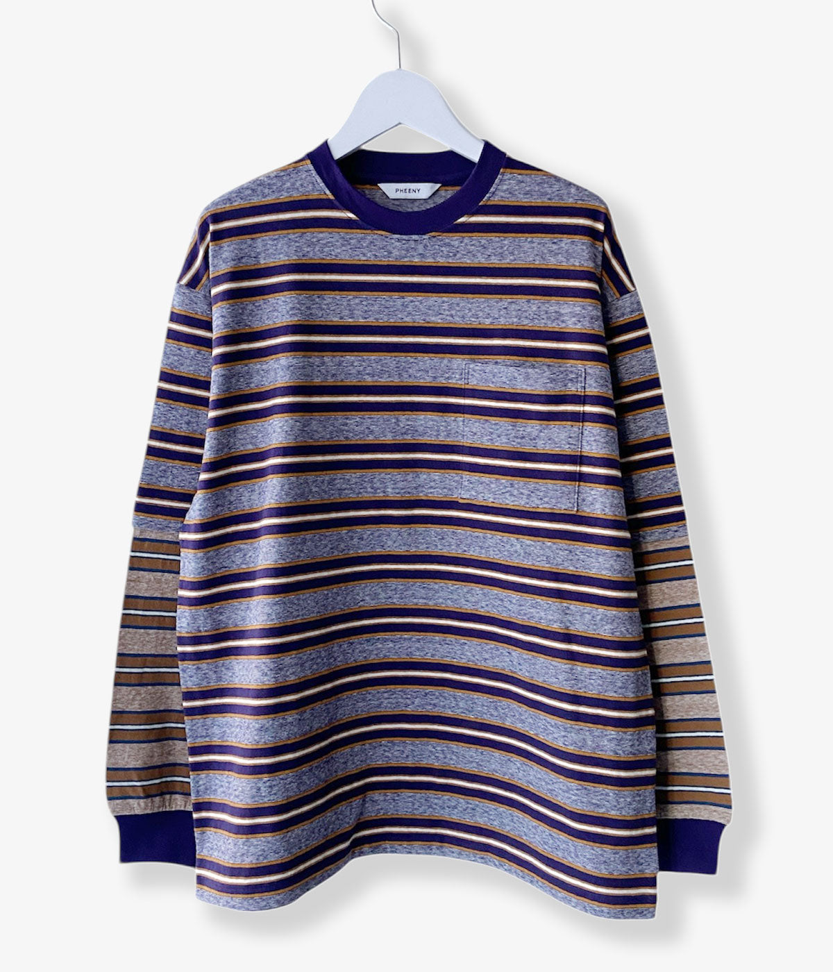 PHEENYからMULTI BORDER LAYERED L/Sが入荷しました。リラックス感のあるボクシーなシルエットのロンT。レイヤード風の袖ディテールがポイントの一着です。70年代を彷彿とさせるヴィンテージライクなボーダーでリラックスしたコーディネートに最適です。