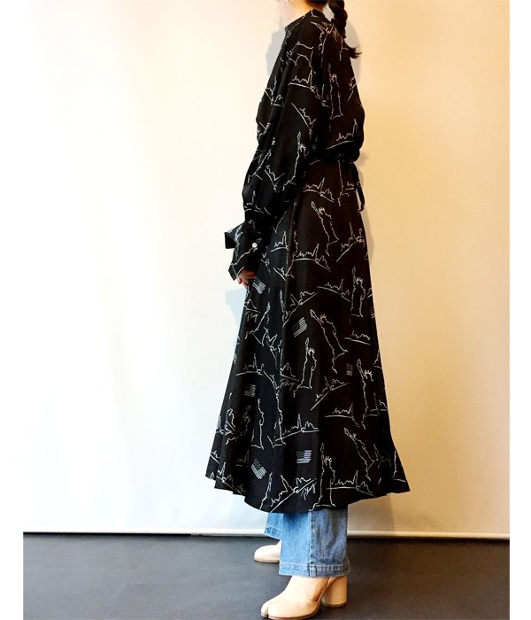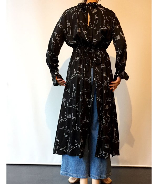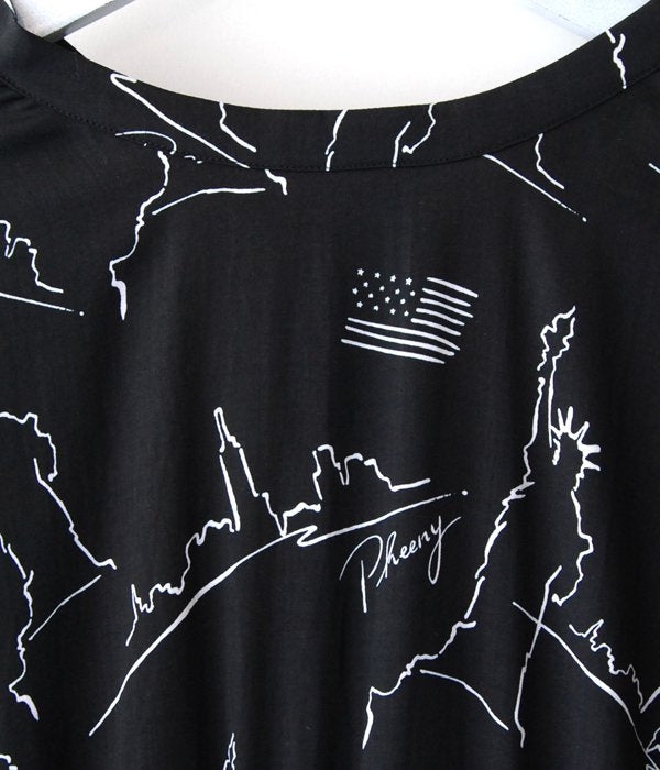 いつもより少し柔らかなレーヨンに、今シーズンはデザイナーが旅をしてインスピレーション源となったニューヨークのアイコンをPHEENYらしいグラフィックに落とし込んだ生地を贅沢に使用しエレガントな印象に仕上げたドレス。バックオープンデザインでインナーやボトムスとのレイヤードが楽しめます。ウエストのリボンでシルエットを調節したり、思い切って前後逆に着用してガウンのようなスタイリングをしたり、自由な着こなしの出来る1枚。
