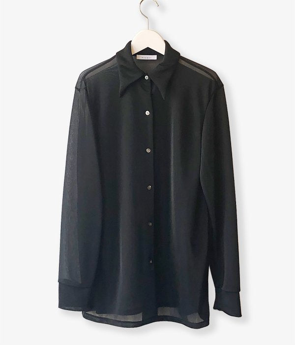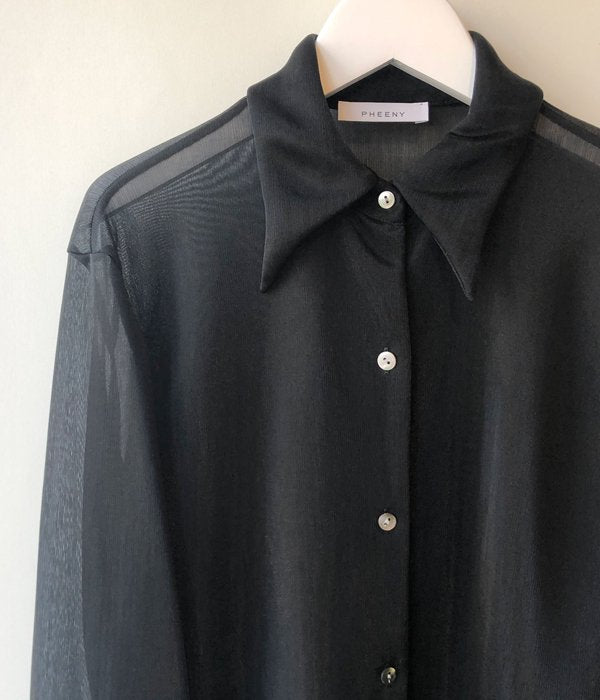 PHEENYからNYLON SMOOTH SHIRTが入荷しました。70'sのようなロングポイントの衿が特徴のシャツ。モノフィラメントナイロンを使用した新感覚のスムース素材は半透明で生地の厚さがありドレープ性にも優れています。透け感が新鮮でモードな雰囲気の着こなしが楽しめます。