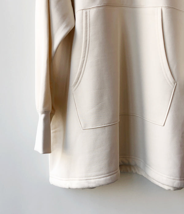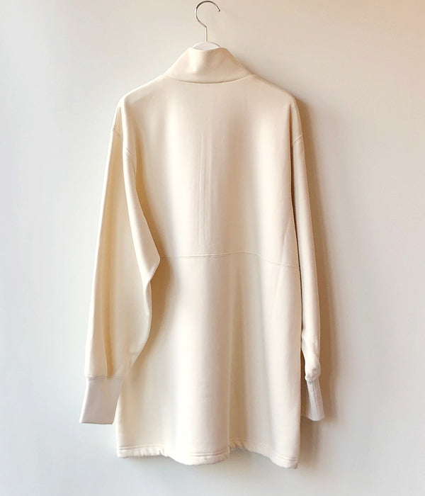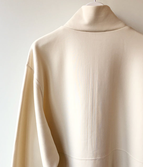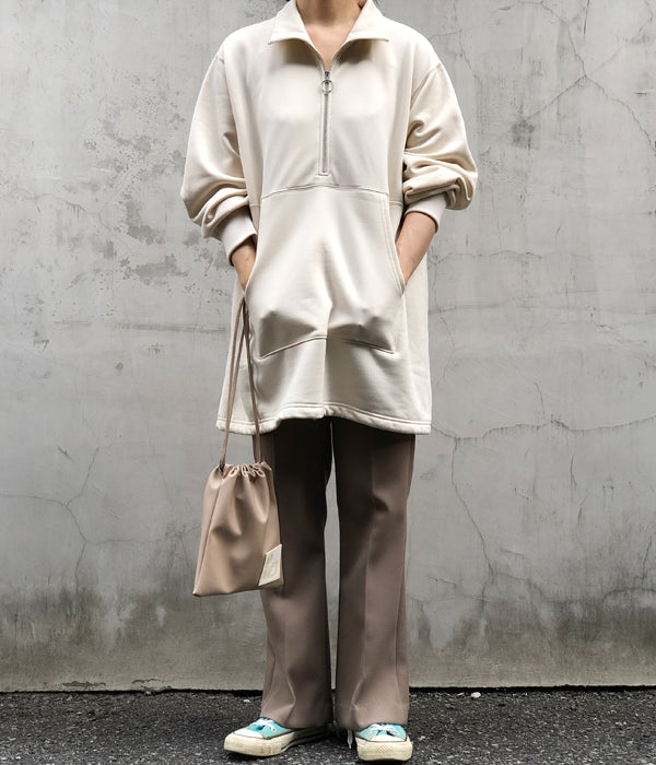 PHEENYからNYLON SWEAT HALF ZIP P/Oが入荷しました。滑らかで光沢のあるオリジナルの裏毛を使用のハイネックプルオーバー。速乾性がありシワになりにくく丈夫な表面と肌に触れる裏面には綿を使い肌触りの良さも兼ね備えています。アウター感覚で着用できるゆったりボリュームのあるシルエットでメンズも着られるサイズ感。裾のスピンドルを絞ることでシルエットの調整も可能です。