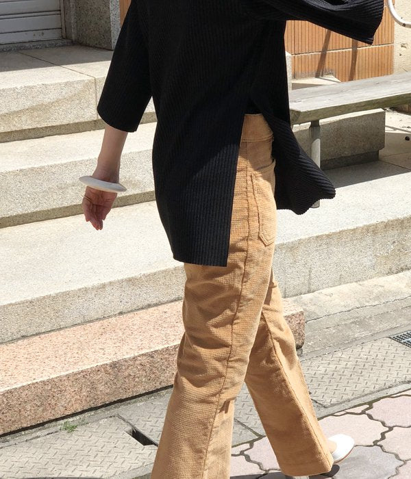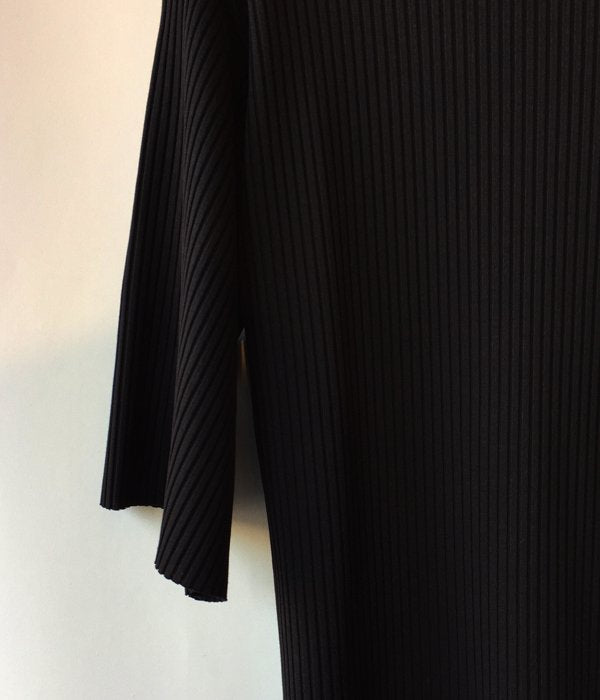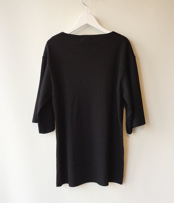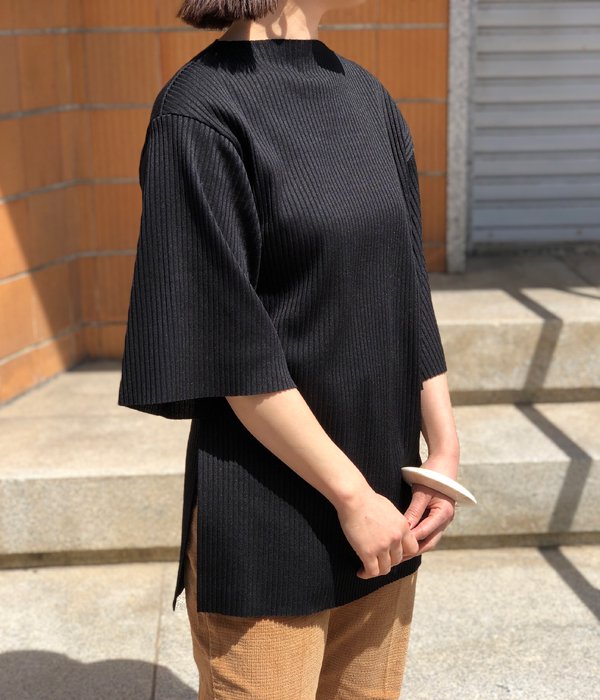 ドライタッチでさらっとした肌ざわりが特徴のリブ素材トップス。長めのサイドスリット、ヒップが隠れるミドル丈、袖は6分丈でリラックス感のある仕上がりに。裾・袖口・スリットは裁ち切りでクリーンな印象。ボトムのシルエットを選ばず着られる一枚となっています。