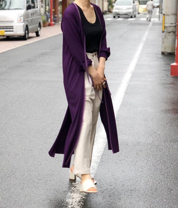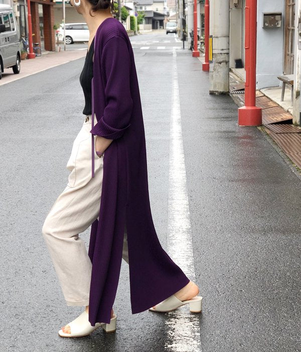 ドライタッチでさらっとした肌ざわりのリブ素材はポリエステル混で綿100%のものに比べて洗濯を繰り返しても縮みづらいという特徴も持っています。フロントのリボンは結んでも結ばなくてもOK。幅広いスタイルに合わせやすく、しわが付きにくいのも嬉しいポイント。かなり使えるロングカーディガンです。