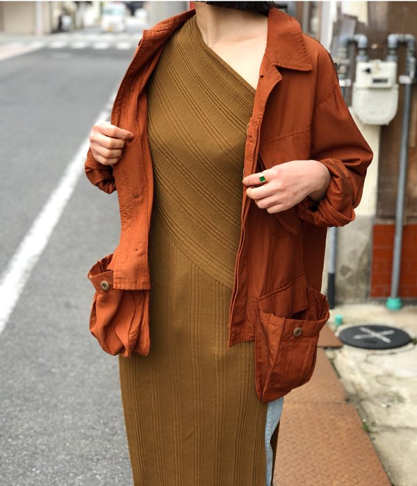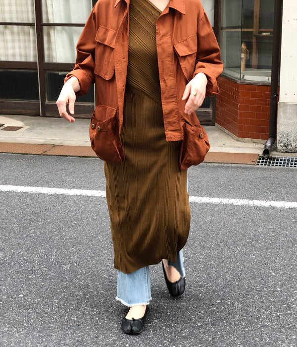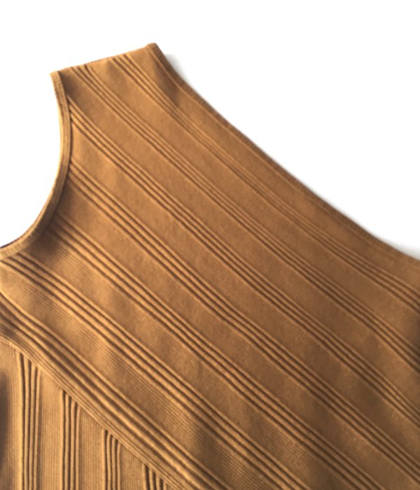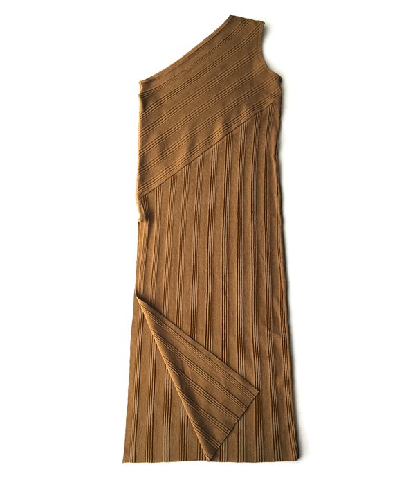 ランダムな針抜きテレコ生地で構築されたワンショルダードレス。斜めの切り替えがポイントで、一枚でも着られるようフィット感のある仕上がり。リブ目のラインで着やせ効果も◎。サイドスリットで抜け感をプラスし、パンツとのレイヤードが楽しめます。