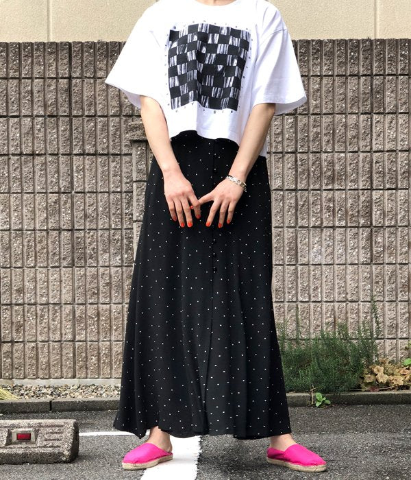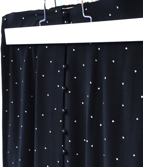PHEENY定番オリジナルプリントシリーズのロングスカート。ドット柄は良く見ると小さなハート型。生地表面の凸凹感、レーヨンのドレープが特長です。フロントに深めに入ったスリット、70年代の古着のような足つきのボタンもポイント。単品使いはもちろん、同素材のシャツとセットアップでの着用もおすすめです。