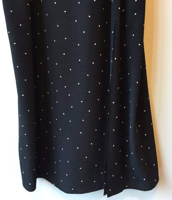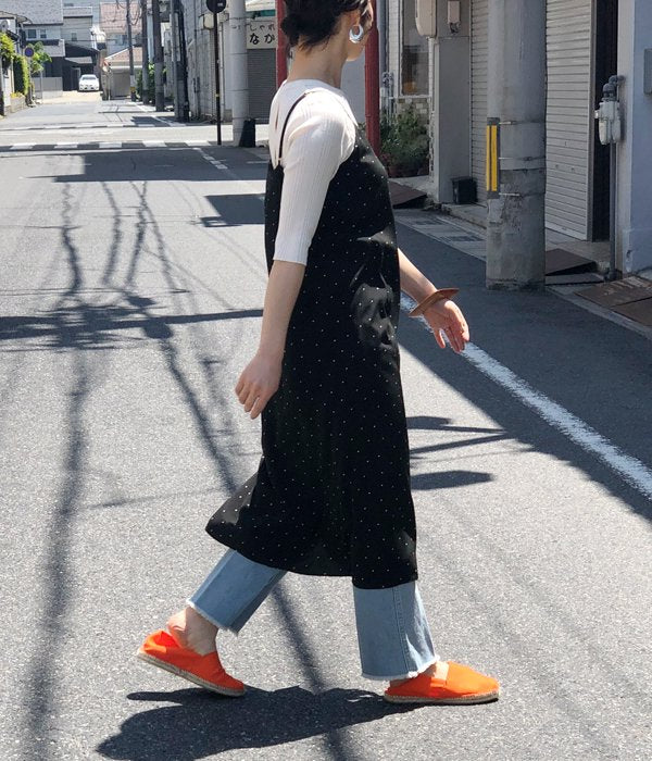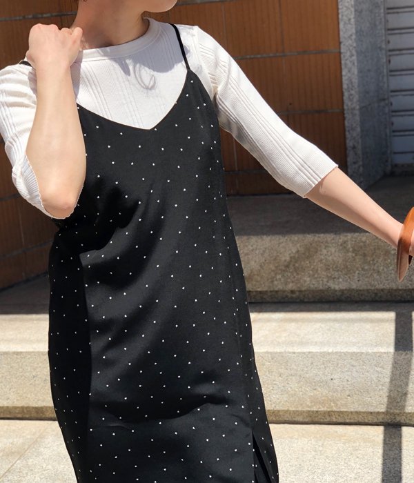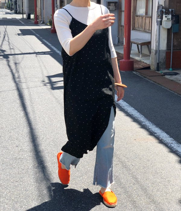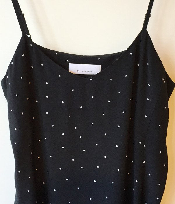 PHEENY定番オリジナルプリントシリーズのキャミソール型ワンピース。ドット柄は良く見ると小さなハート型。今シーズンは裾にスリットを入れ丈も少し短くし、より着まわしやすく仕上がっています。一枚でももちろん、ボトムスとのレイヤードも楽しめます。