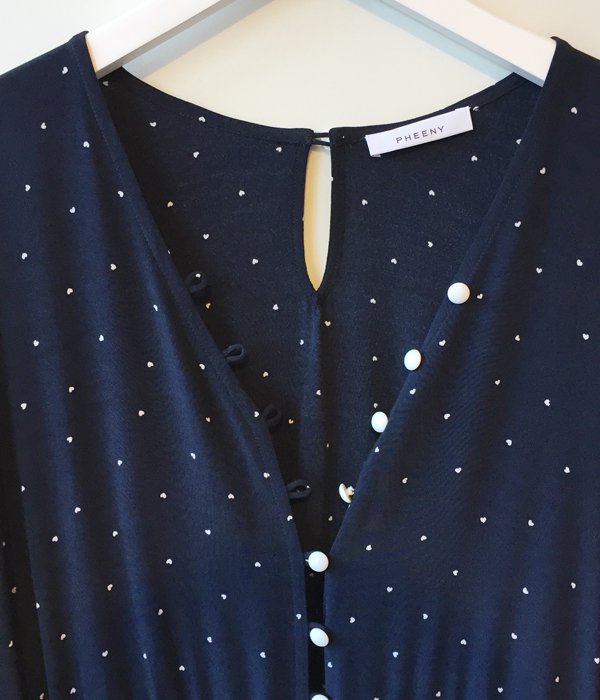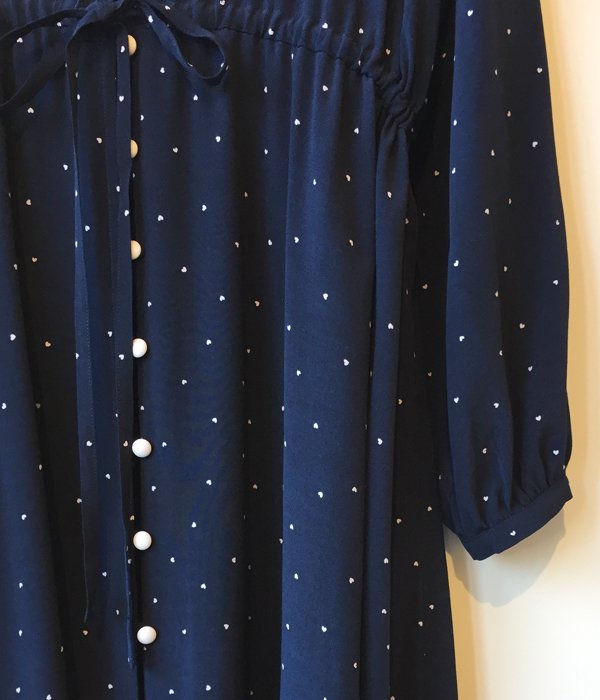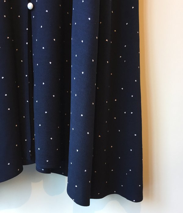 PHEENY定番オリジナルプリントシリーズの今回は小さなハートドット柄。レーヨンのドレープ感、ボリュームのあるシルエットや古着に見られるボタンがレトロな雰囲気を演出します。前後どちらでも着用可能で、釦を外しガウンのように羽織る事も出来るマルチWAY仕様。