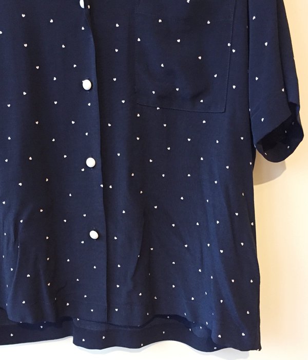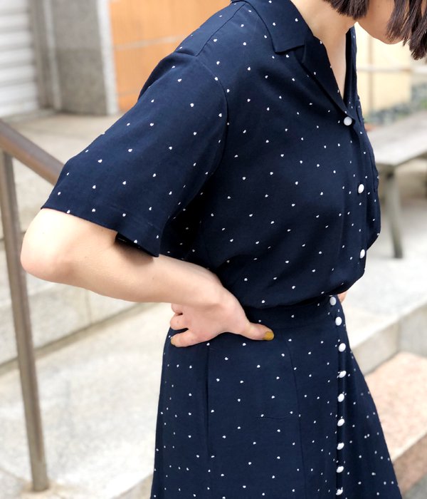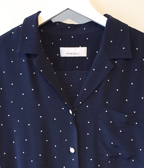 PHEENY定番オリジナルプリントシリーズの半袖開襟シャツ。ドット柄は良く見ると小さなハート型。生地表面の凸凹感、レーヨンのドレープが特長でリラックス感ある仕上がりに。前を開けてラフに羽織ったり、同素材のスカートやパンツとセットアップでの着用もおすすめです。