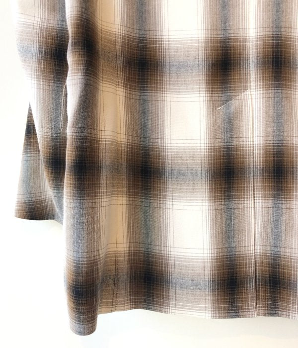 PHEENYからRAYON OMBRE CHECK DOUBLE-BREASTED JACKET(BROWN)が入荷しました。定番のオリジナルチェック柄を使用のダブルのジャケット。レーヨン独特のドレープ感、さらっと快適なアイスタッチの肌ざわりが特徴。仕立ての綺麗さに拘りながら、シルエットとラフな生地感がパジャマのようなニュアンスも感じさせるPHEENYらしい一枚です。