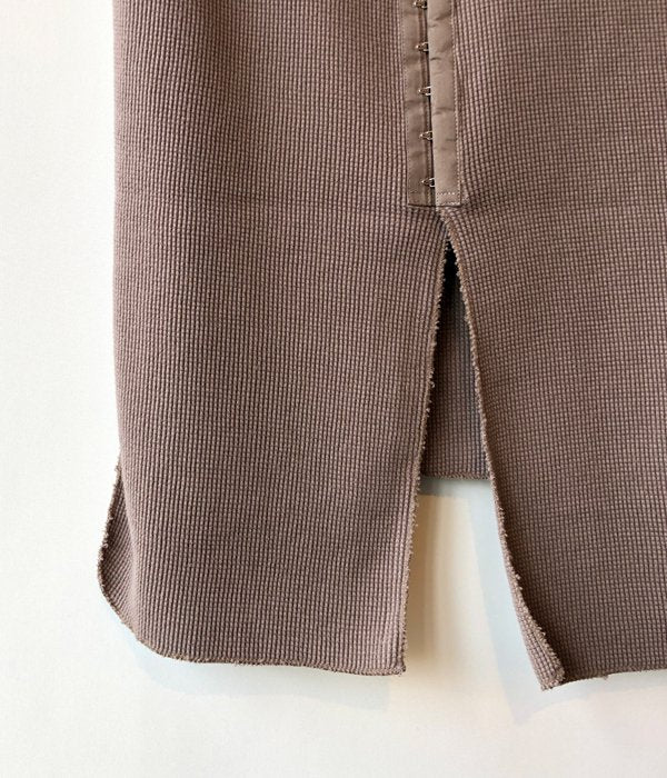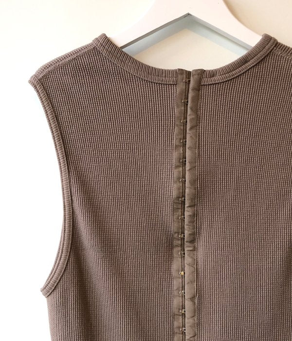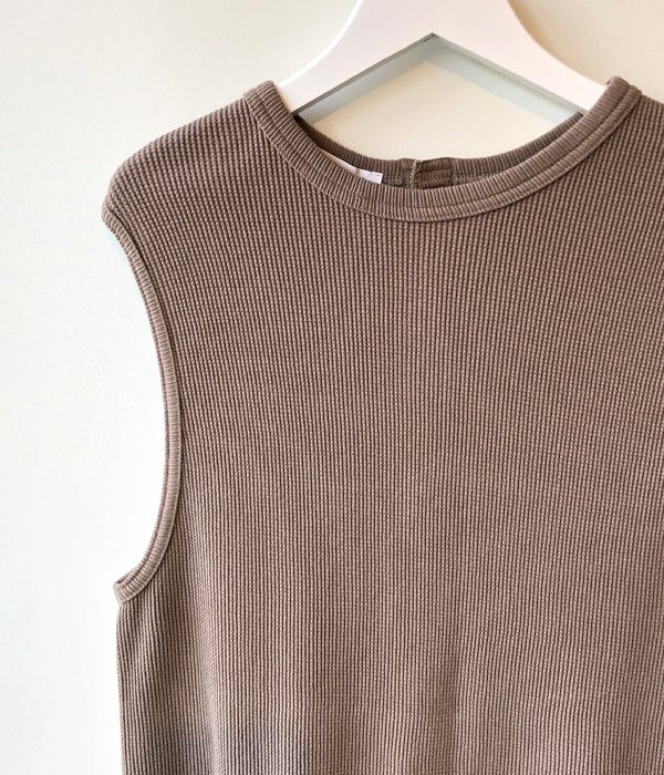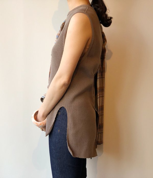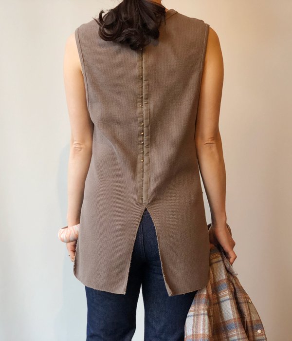 PHEENYからWAFFLE HOOK TAPE N/Sが入荷しました。毎シーズン人気のサーマルノースリーブがアップデートされ登場。今シーズンは後身頃にフックテープを付けデザイン性をプラス。柔らかいワッフル地の着心地の良さは抜群で、ほど良いフィット感と長めの丈が様々なボトムスと合わせやすい一枚となっています。