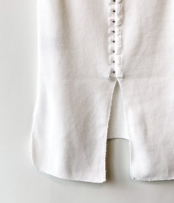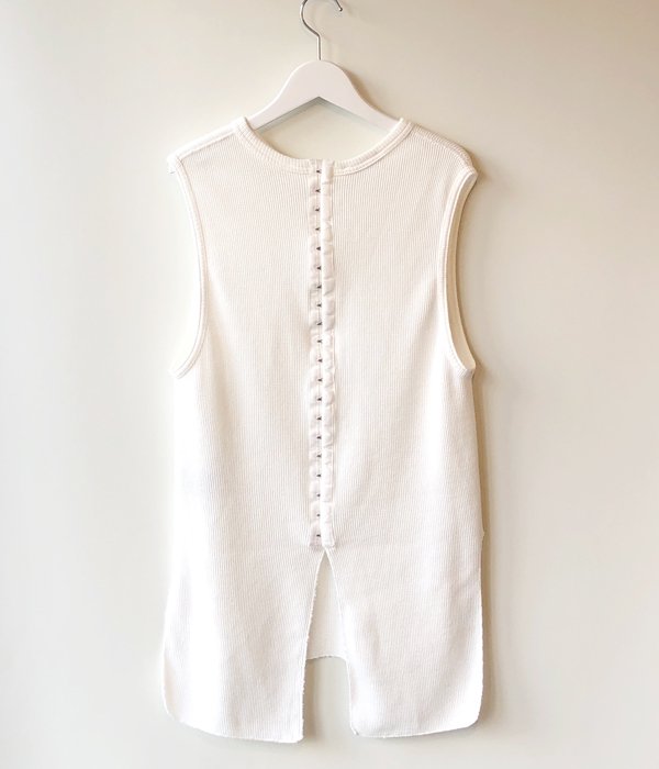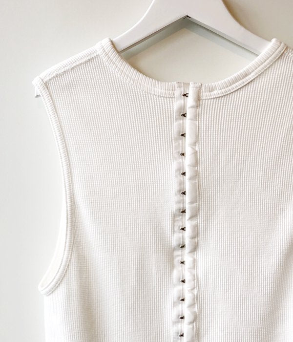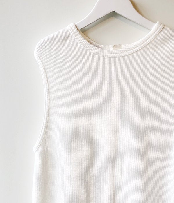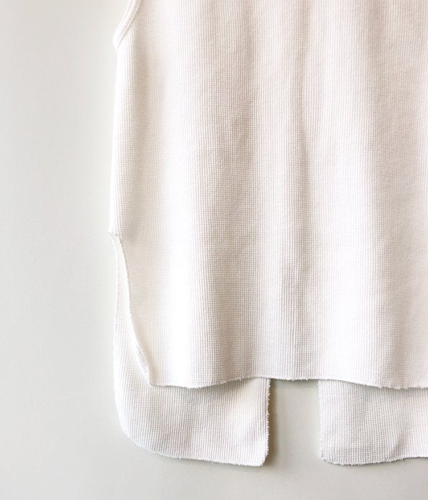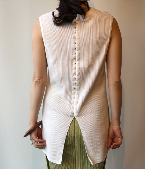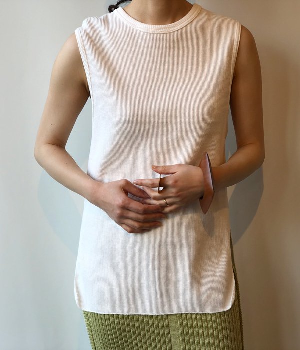 PHEENYからWAFFLE HOOK TAPE N/Sが入荷しました。毎シーズン人気のサーマルノースリーブがアップデートされ登場。今シーズンは後身頃にフックテープを付けデザイン性をプラス。柔らかいワッフル地の着心地の良さは抜群で、ほど良いフィット感と長めの丈が様々なボトムスと合わせやすい一枚となっています。