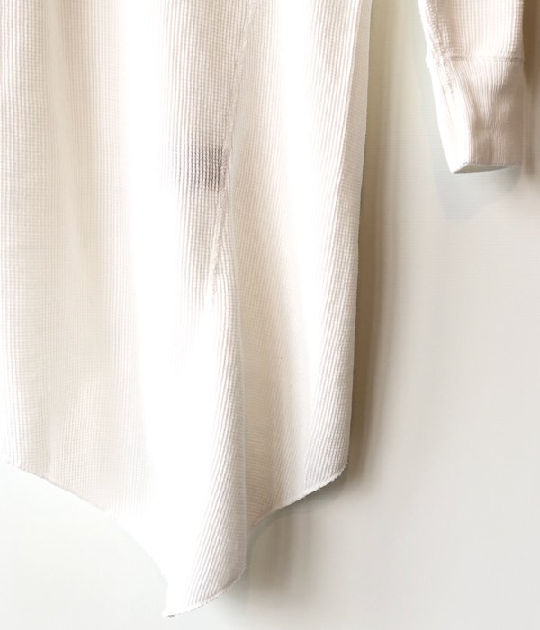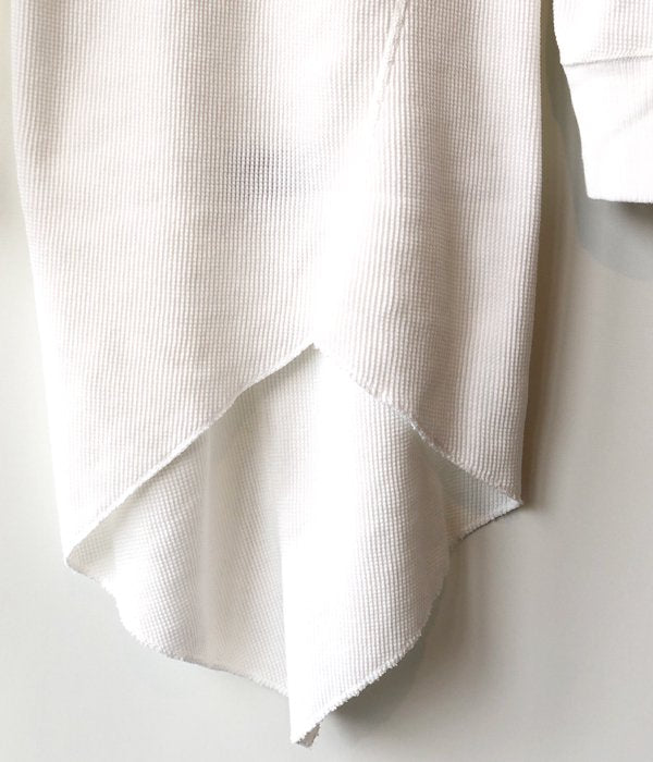 PHEENYからWAFFLE TWIST L/S(WHITE)が入荷しました。肌触りの良いコットンワッフル生地を使用し、身頃をねじったようなデザインをパターンで構築したロングスリーブサーマル。カジュアルな印象のサーマルながらドレープやアシンメトリーにカットされた裾などにデザイン性の高さを感じます。伸縮性を活かしブラウジングさせて丈感を変えることも可能。幅広い着こなしを楽しめます。