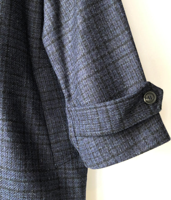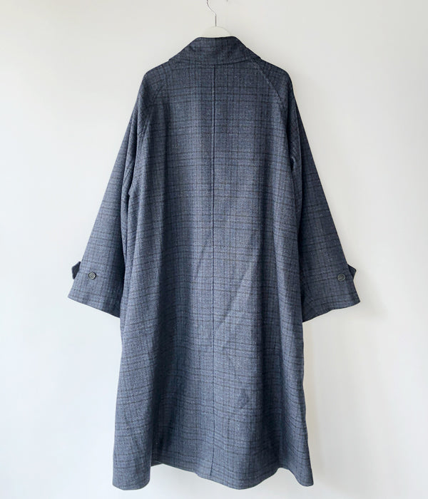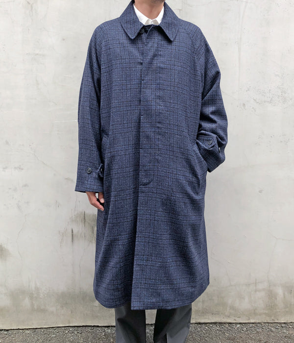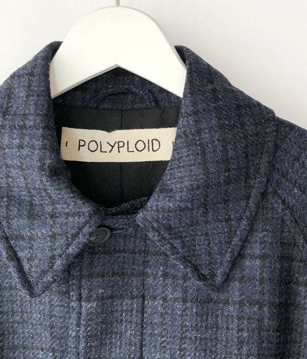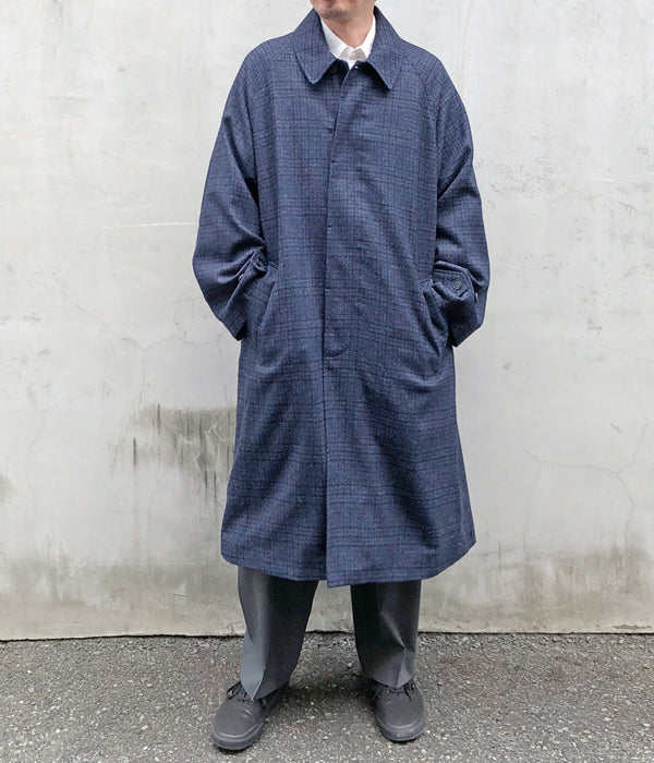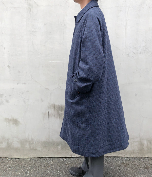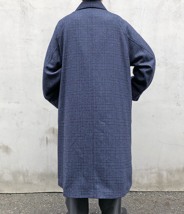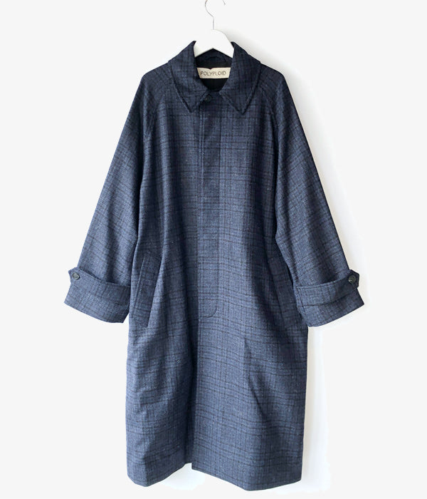 POLYPLOIDから、LONG COAT Bが入荷しました。定番のフライフロント仕立てのステンカラーコート。ウール素材を使用した上品なチェック柄が美しく、温もりのある生地感が特徴。ゆったりとしたAラインシルエットに、アームホールもワイドな設計で、厚手のインナーでも合わせやすく着心地を妨げません。