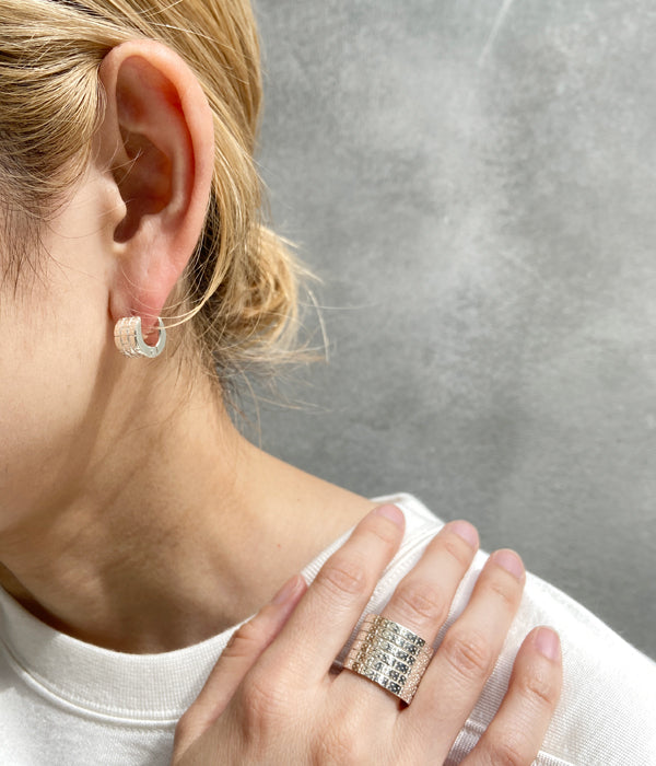 R.ALAGANからDOT TILE HOOPS(SILVER)が入荷しました。Eileen Grayのパネルスクリーンをイメージしたリング。テクスチャーを入れることで表情を生み出し、柔軟な女性像を表現しています。リングとお揃いで付けるのもおすすめです。